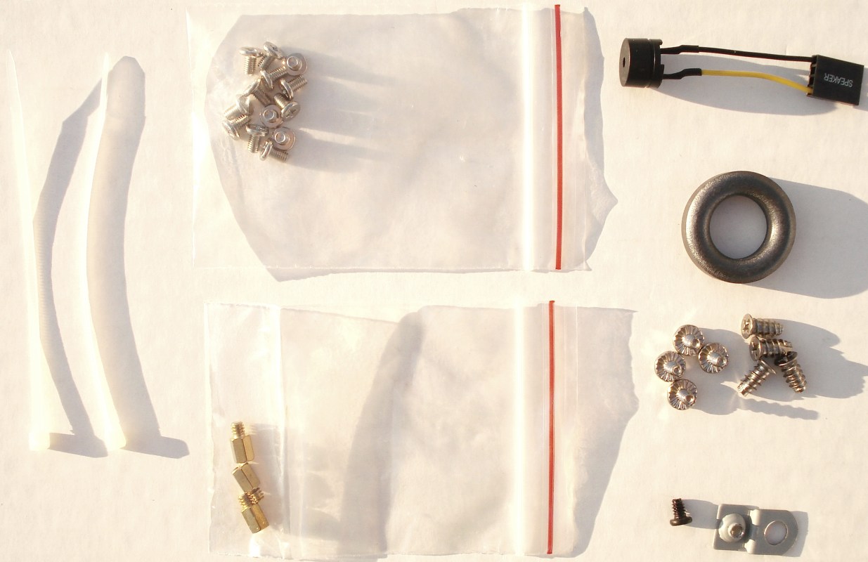 Por último, todos estos accesorios vienen metidos en otra bolsa hermética más grande. Todos sirven para montar otros componentes, como la fuente, un ventilador o la placa base. Tendremos otros sistemas de recogida de cables, como el aro metálico y las bridas. Además destacamos que tendremos adjunto un altavoz para nuestra placa base (el que nos proporciona los pitidos de la BIOS). Normalmente este altavoz viene ya montado en la propia semitorre con un cable mucho más alto. Últimamente ya se emplea este tipo, siendo más práctico.