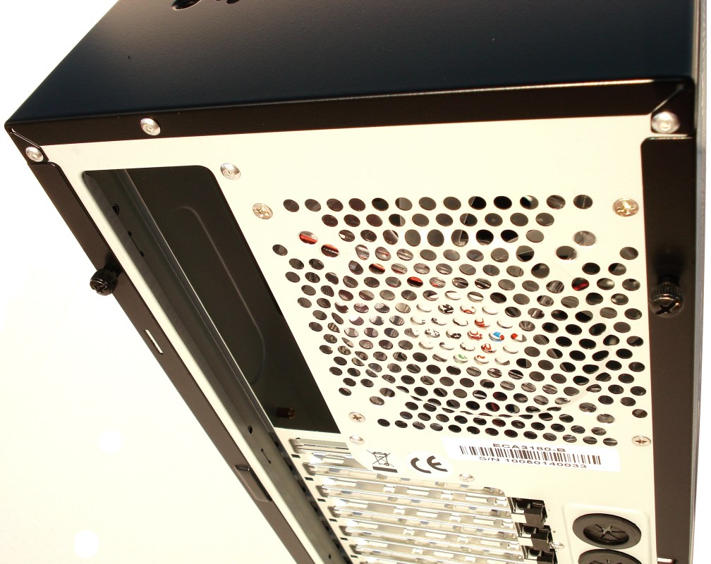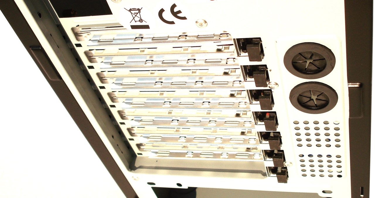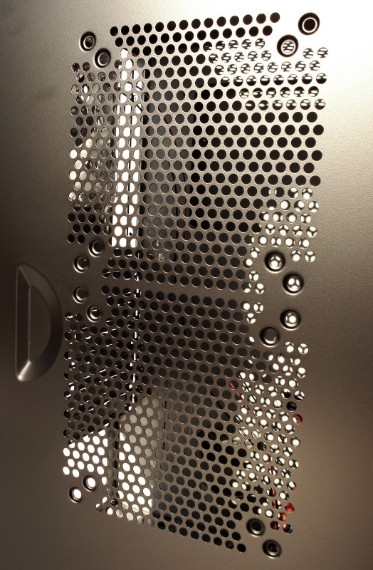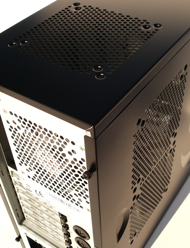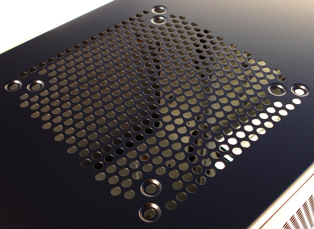 Respecto a la rejilla del lomo superior, tenemos la posibilidad de montar un ventilador de 14 o de 12cm, teniendo las 8 perforaciones para tal fin. La rejilla está simplemente perforada con taladro circular, suficiente para el paso del aire. El sistema de paso de aire en «nido de abeja» es más eficiente que este sistema circular, por dejar más paso de aire.