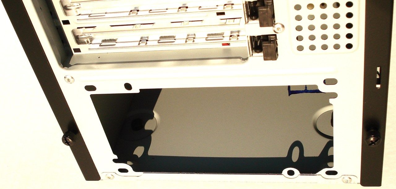 En la parte inferior trasera se destaca el orificio para armar la fuente de alimentación. Este orificio tiene 8 perforaciones para poder montar la fuente hacia arriba o hacia abajo, aumentando así en versatilidad. Esto que parece una tontería, no lo es, y muchos fabricantes simplemente solo facilitan 4 de las 8 perforaciones. No obstante, en el inferior de la torre no tenemos perforaciones del paso de aire, ni ningún filtro, por tanto, vemos solo adecuado el montar la fuente con su ventilador hacia arriba.