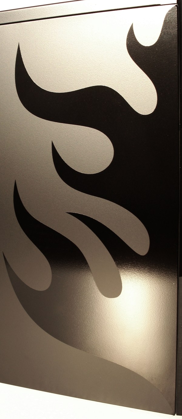 ¡Guau! Esto es lo primero que se nos ocurre al ver este vinilo. Su diseño es simple y efectivo, dando agresividad al aspecto general exterior de la VOLCANUS, haciendo honor a su nombre por el arder de la llama. El vinilo sobresalta por ser en negro brillo, contrastando con el negro mate del conjunto exterior del laminado metálico. Junto con el frontal de plástico, también en negro brillo, hacen un conjunto muy vistoso. Y precisamente a él vamos ahora. Veamos el frontal al detalle, siendo éste lo más llamativo de esta semitorre…