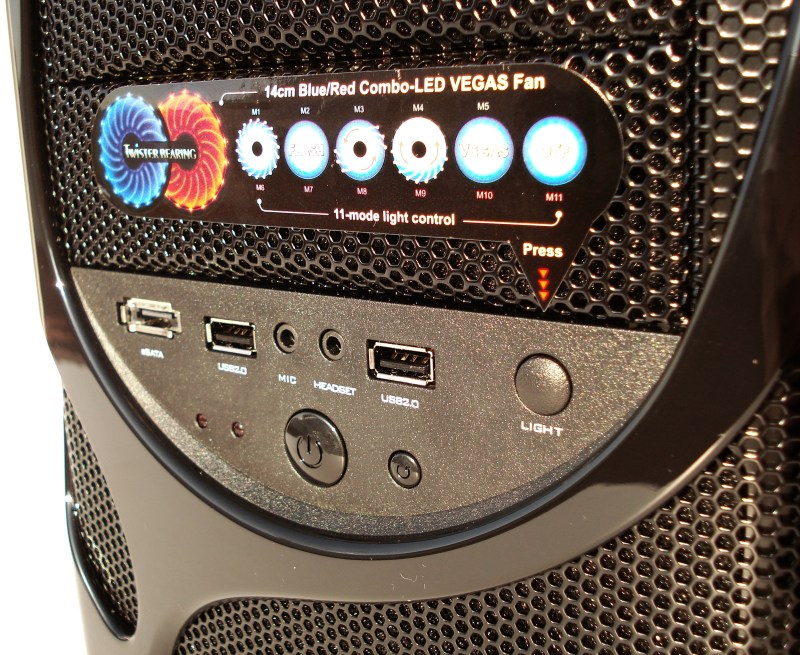 En general, la superficie es bastante plana, resaltando ligeramente su acabado en llama, sin ninguna puerta o compartimento que se extraiga por su frontal. En la parte superior tenemos acceso a los frontales de las unidades de 5.25″ (sin la posibilidad de instalar unidades de 3.5″, como pueden ser disqueteras o lectoras multitarjetas de memoria), en la central el panel y en la inferior una zona de paso para la entrada de aire. Esta zona inferior alberga el aclamado ventilador APOLLISH VEGAS que potencia aún más la capacidad de refrigeración del conjunto, dándole un toque modding sin igual, gracias a sus LEDs bicolor en rojo y azul, con diferentes configuraciones de iluminación.