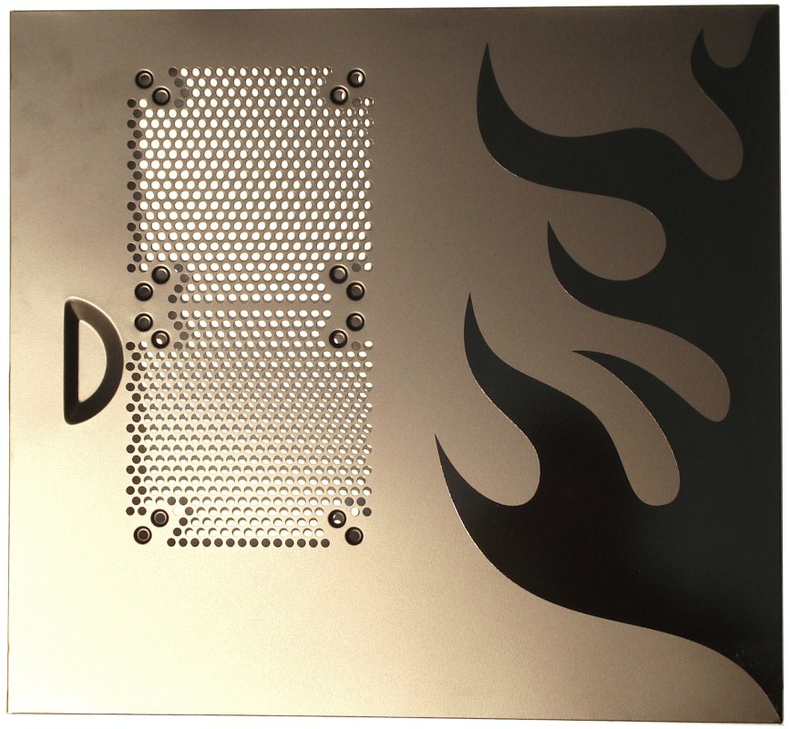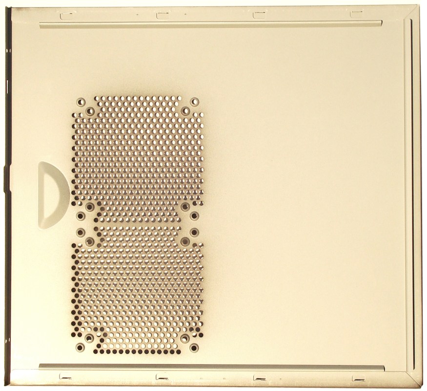 El laminado del lateral es suficientemente resistente y no vibra con facilidad. La parte exterior está totalmente pintada en negro mate, tal como hemos visto anteriormente. En cambio, la parte interior no lo está. En dicha parte hay 2 refuerzos metálicos con pliegues con terminaciones dobladas para dar rigidez a la lámina metálica en la zona superior e inferior. Así, al menos 3 de los 4 bordes lineales quedan más rígidos.