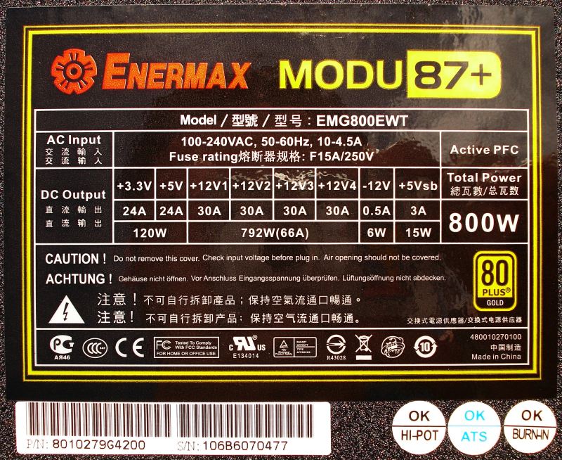 ENERMAX MODU87+ 800W. Detalle Etiqueta Especificaciones Técnicas