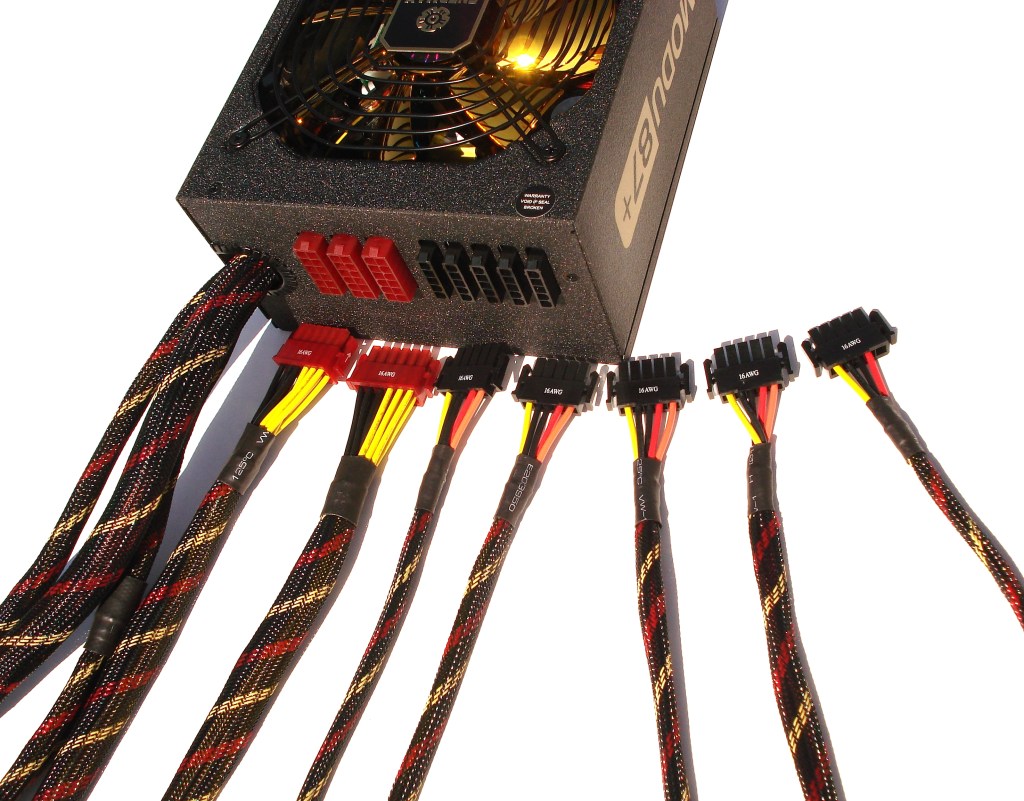 Las fibras del enmallado para proteger todo el cableado nativo y modular posee un acabado brillo en color negro con encintado en espiral rojo y dorado, diseño que nos puede recordar a los cordones y que es empleado por otros fabricantes, con otros aspectos y colores. Estas fibras son ignífugas, y cubren por completo todo el cableado interior, impidiendo que podamos verlo a simple vista. Este enfundado es bastante flexible, permitiendo doblar el cableado con relativa facilidad, pero a su vez garantiza que no lo doblemos en exceso.