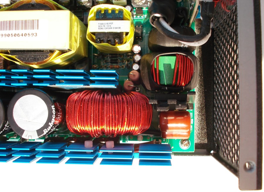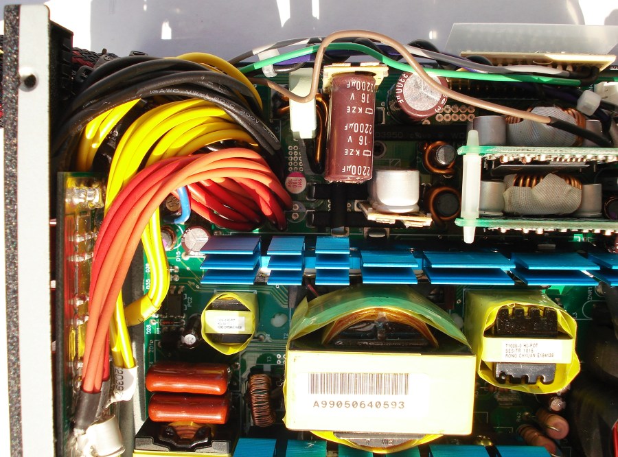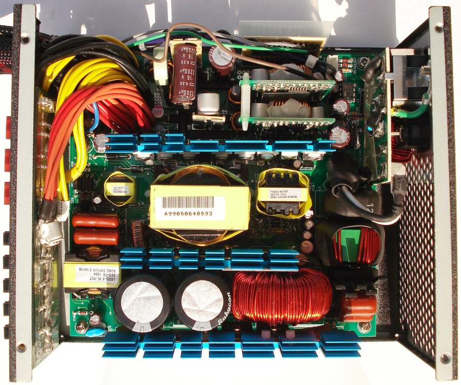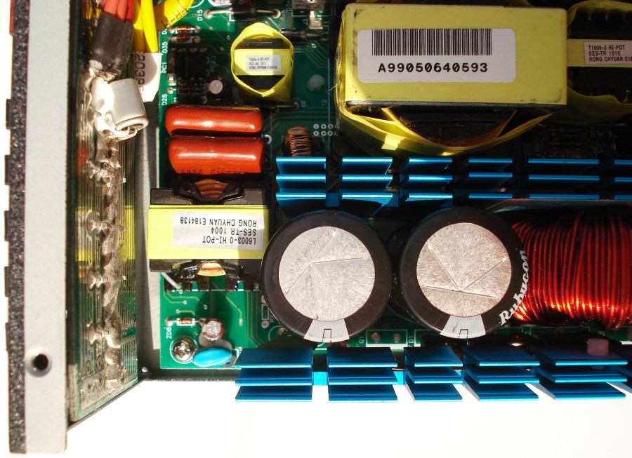 De entrada, su distribución es la lógica y francamente bien repartida. Se han colocado los disipadores de refrigeración (siendo éstas las piezas que más abultan) en perpendicular a la rejilla de «nido de abeja» para redirigir el flujo de aire hacia esta zona de salida del flujo. A su vez, esta zona no posee grandes componentes eléctricos que obstruyan en exceso el paso de dicho flujo de aire hacia el exterior. A la derecha de la fotografía tenemos la zona de entrada de corriente alterna (CA) y a la izquierda (opuesta a ésta) la zona de salida de corriente continua (CC).