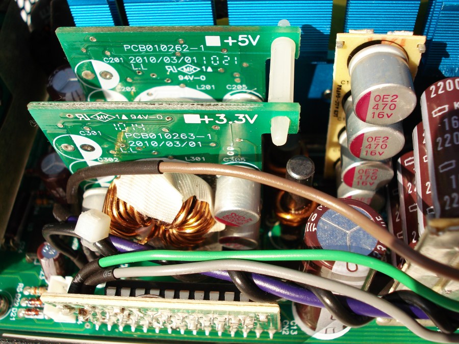 Esta es la zona de regulación y estabilización de la corriente continua. El fabricante ha dotado de condensadores sólidos a parte de los condensadores líquidos para conseguir mayor estabilidad para las tensiones de salida. En esta zona ya se mueven tensiones entre los 3 y 13V. El empleo de condensadores sólidos se traduce en una duración mayor. La mayoría de las fuentes de alimentación del mercado todavía no emplean este tipo de capacitadores, limitándose a los capacitadores líquidos, de mayor tamaño, menor vida útil y en general, más baratos.