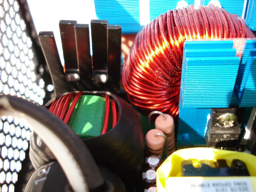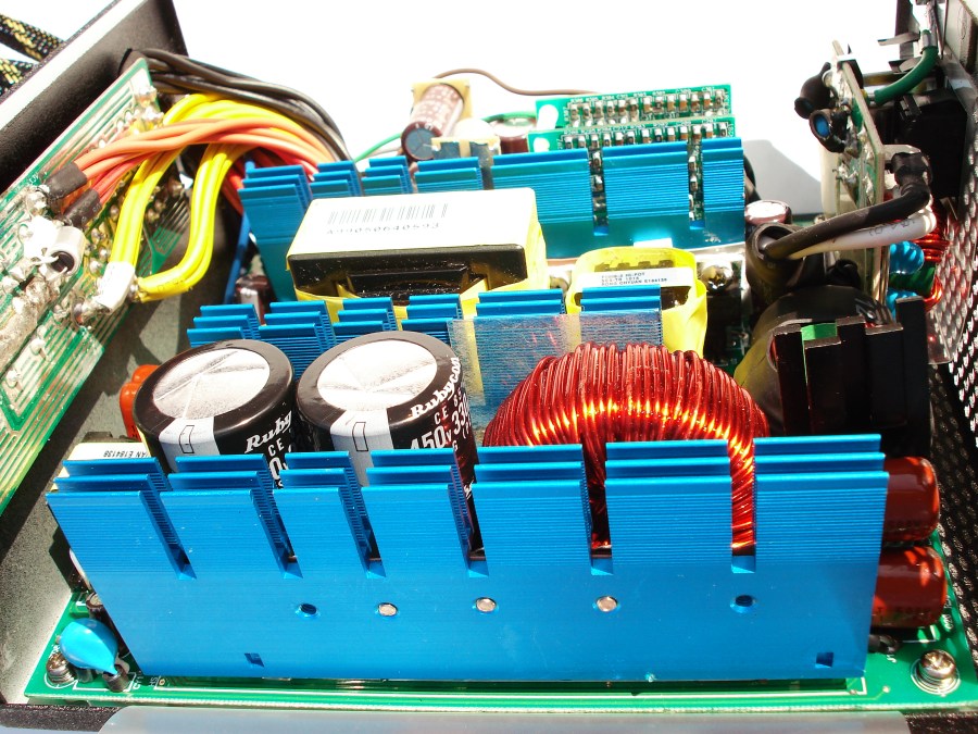 Los 3 disipadores de color azul tienen el mismo perfil. Son una fina lamina de unos 2mm de espesor que se se ramifica en 3 láminas por la parte superior, para conseguir mayor superficie de contacto con el aire, aumentando así su capacidad de disipación térmica. Además dispone de otro pequeño disipador de aluminio, esta vez pintado en negro en la parte derecha, con otro tipo de perfil. Todos ellos están en contacto con los diodos de rectificación de corriente. Estos semiconductores de 3 polos actúan como elementos de transición de corriente (compuertas eléctricas) y por ello, son los puntos que mayor calor generan en el interior de la fuente. Todos están atornillados a las placas de aluminio y separados por una fina capa de compuesto térmico para garantizar el paso correcto de la térmica entre ambos cuerpos, diodo y aluminio.