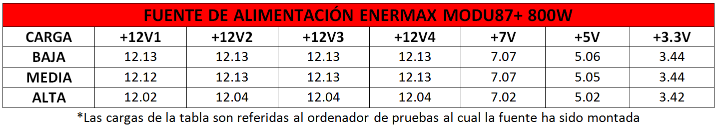 ENERMAX MODU87+ 800W. Test Polímetro. Tabla Comparativa de Resultados
