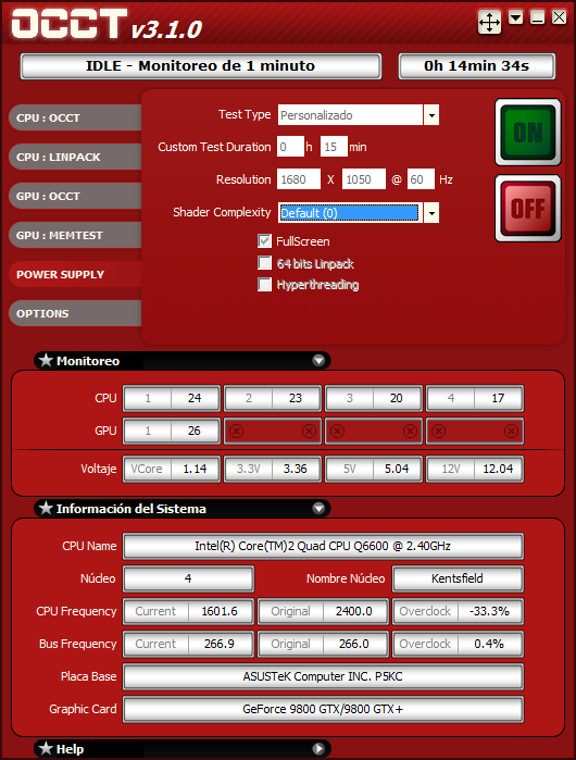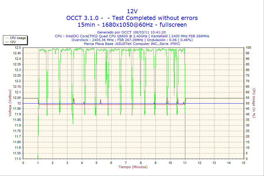 Para realizar este test, hemos optado de nuevo a recurrir al software OCCT. Este software tiene una configuración en el «test Power Supply» que provoca que todos los componentes del PC (CPU, RAM, Gráfica) se pongan al máximo durante el periodo del test. Esta prueba de estrés genera el consumo aproximado de la máxima potencia que requiera el pc, y por tanto se puede medir la estabilidad y comportamiento de las tensiones de salida de corriente continua, según la fuente entre en carga y deje de estarlo. El test se ha realizado durante 15 minutos en pantalla completa de resolución 1680 x 1050 para cargar aún más la tarjeta gráfica, tiempo suficiente para ver el comportamiento de la MODU87+.