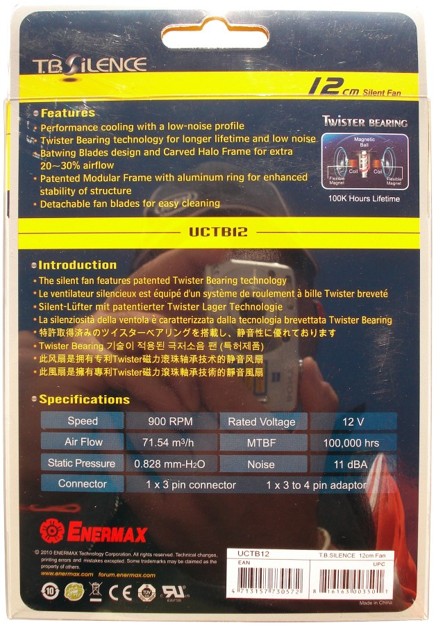 En la parte trasera de la caja podemos ver las características y las especificaciones técnicas del ventilador, ya listadas en la página 2 de este análisis. De nuevo la marca, el modelo, el tamaño, destacando la tecnología «Twister Bearing» que consigue una duración estimada de uso de 100.000 según el fabricante. Destacamos su caudal de aire de 71’54 m3/h con 900R.P.M. causando tan solo 11dBA, cosa que no está nada mal para un ventilador de 12cm. Abajo podemos apreciar el código de barras del producto, así como que está fabricado en el año 2010 en China.