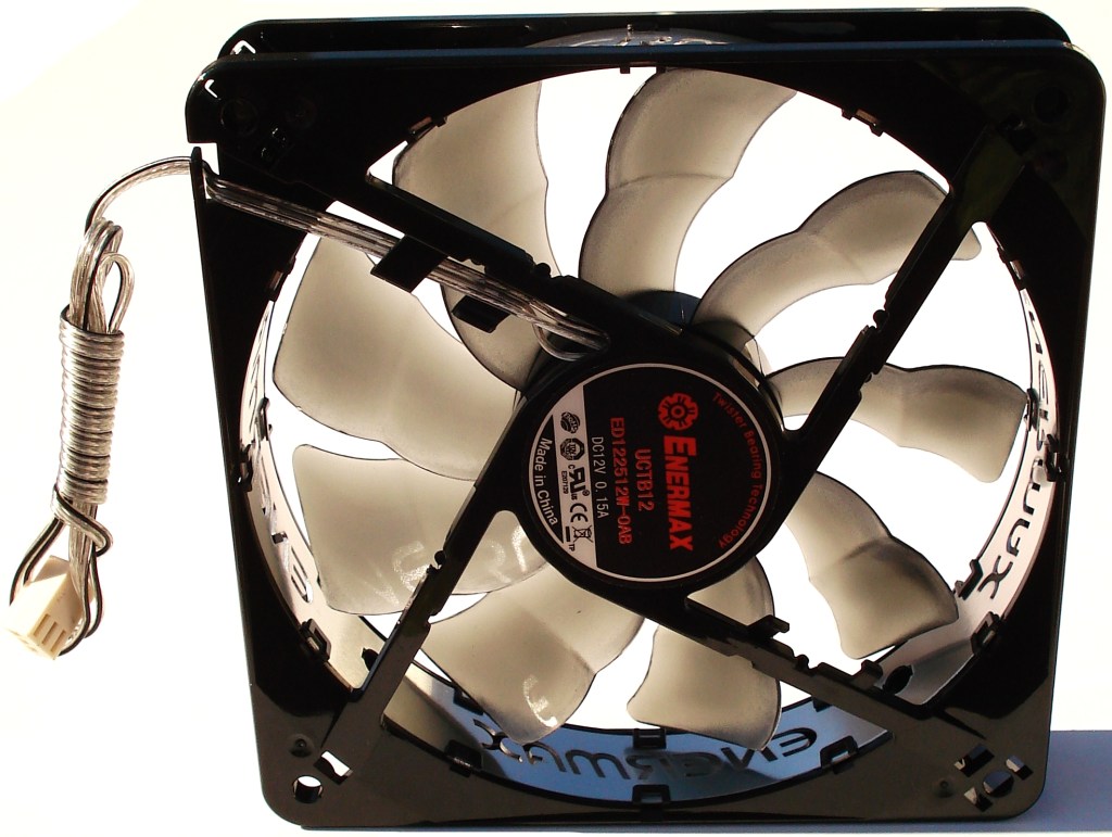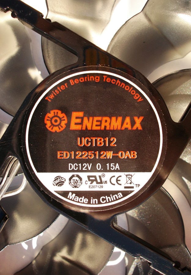 En la parte trasera del rotor podemos ver la pegatina que nos suele especificar algún dato técnico del motor. Funciona con 12V de tensión, a 0.15A. Se concreta de nuevo la ya nombrada Tecnología «Twister Bearing» el nombre de la marca ENERMAX y el modelo UCTB12 ED122512W-0AB. Fabricado en China y de nuevo se especifica que cumple con las normativa, ya citada en la página 3 de este análisis.