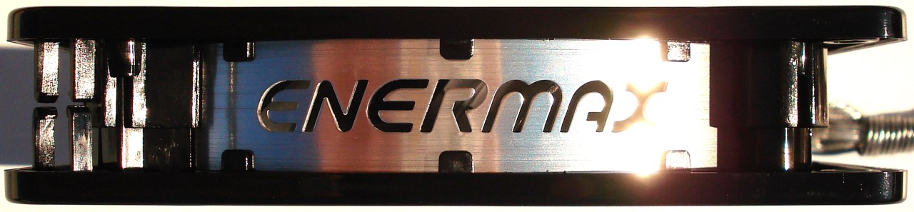 Esta es la vista lateral que hemos podido ver en la vista lateral de la caja antes de abrir. Como podemos apreciar, y que a continuación observaremos con mayor aumento, el marco de plástico está ensamblado perfectamente con el marco en forma de anillo circular de metal de aluminio de aproximadamente 1mm de grosor. Éste no es más que una plancha de aluminio rectangular, doblada y ensamblada con un solo pliegue con un excelente acabado que lo oculta muy bien. Toda la plancha metálica viene perforada con el nombre de ENERMAX en sus cuatro laterales, con un total de 28 letras, consiguiendo aligerar aún más el marco a la vez que deja absorber el aire por las aspas, dejándolo pasar por las propias letras perforadas laterales. Se aumenta de rendimiento al mismo tiempo que se mejora en diseño y aspecto, matando 2 pájaros de un tiro.