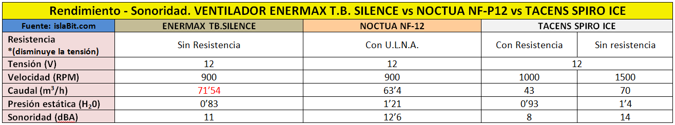 Para realizar estas pruebas hemos optado por elaborar una tabla comparativa de rendimientos de diferentes ventiladores que nosotros consideramos que son de los mejores que hay hoy por hoy en el mercado. Así cogemos nuestro ventilador de análisis y lo comparamos directamente con los ventiladores NOCTUA NF-12 y TACENS SPIRO ICE ambos de 12cm.