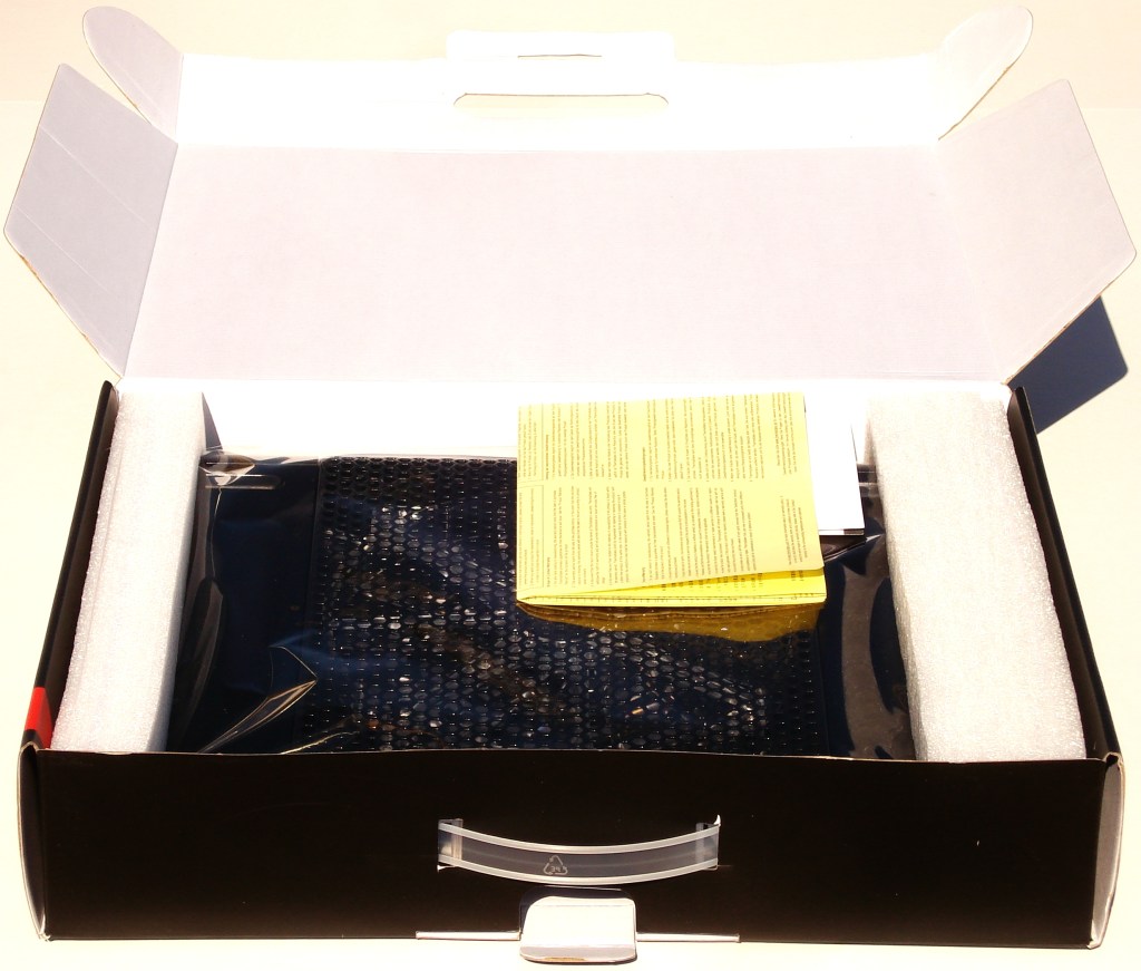 Desprendiendo una lengüeta en la parte superior conseguimos abrir la caja. Este tipo de configuración supongo que será conocida ya por muchos de vosotros, suficientemente segura para que no se abra la caja mientras es transportada cogida por su asa, ya que es la propia mano y la asa la que hace de tope e impide que se abriese en caso de que la lengüeta fallase.