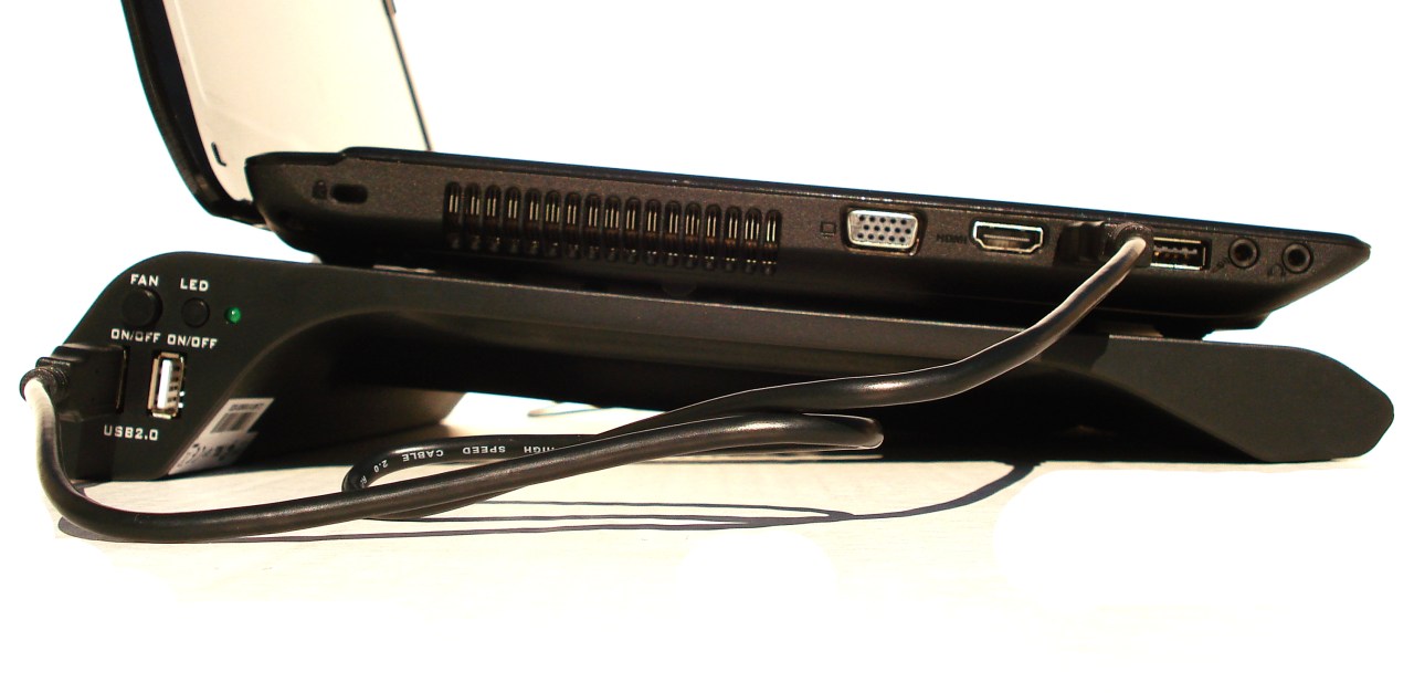 El funcionamiento es bien sencillo. Una vez activamos nuestro portátil, ofrece 5V de tensión a través del cable USB, alimentando el ventilador para que éste ruede. Alcanzando una velocidad de 600 R.P.M., impulsa aire hacia arriba cogiéndolo de la parte inferior de la base. El área de refrigeración de la base frente al notebook es muy buena, refrigerando una superficie de 20 x 20cm, alcanzando la zona del disco duro, del chip gráfico y del procesador principal. Luego veremos una comparativa de temperaturas, a ver cómo se comporta…