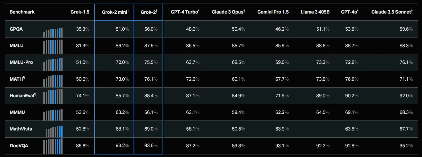 Grok 2.0 fue evaluado inicialmente a través de un índice de referencia conocido como MMLU, obteniendo una puntuación del 87,5%, lo que lo coloca casi al nivel de otros modelos avanzados como GPT-4o, que alcanzó un 87,7% en el mismo test.