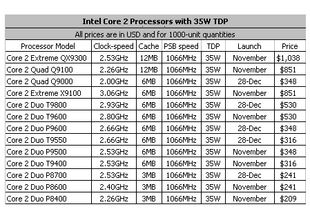 La primera generación de chips de 35W TDP de alto rendimiento para ordenadores de sobremesa utilizando una tecnología de 45nm se dará a conocer este mes, mientras que los chips adicionales se añadirán a la familia el 28 de diciembre. La familia de estos chips de baja potencia para ordenadores de sobremesa, viene integrada por procesadores de doble núcleo y de cuatro núcleos que, seguramente, serán compatibles con la infraestructura LGA775.