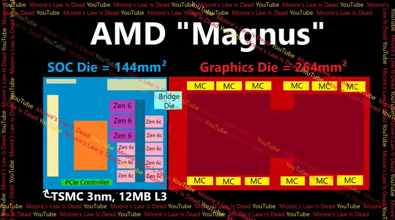 Esta matriz gráfica se une a un SoC de 144 mm² mediante un Bridge Die, formando un diseño cuadrado de proporciones inusuales.