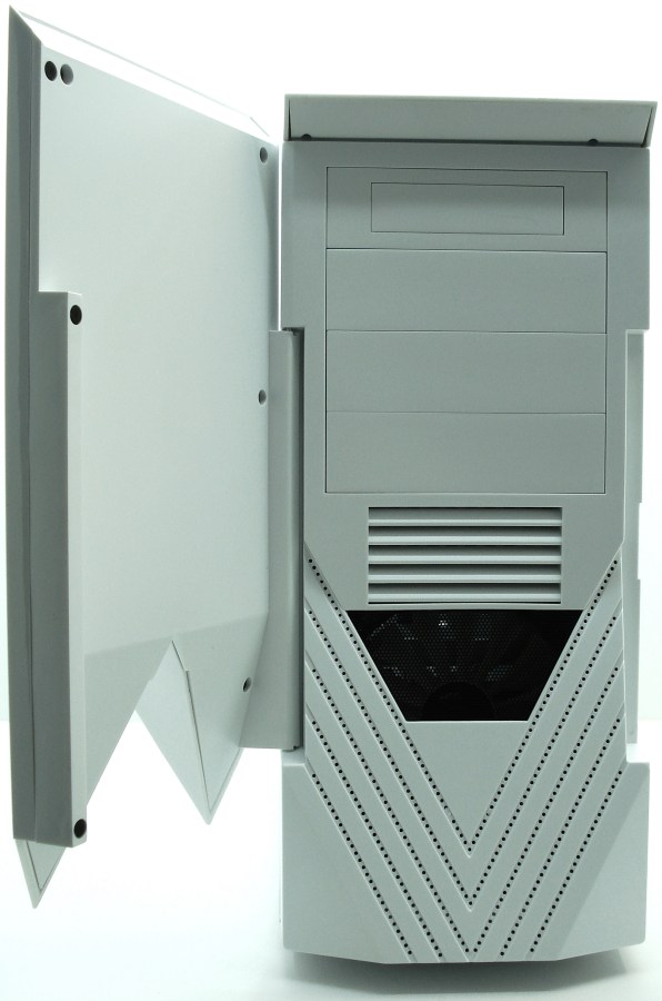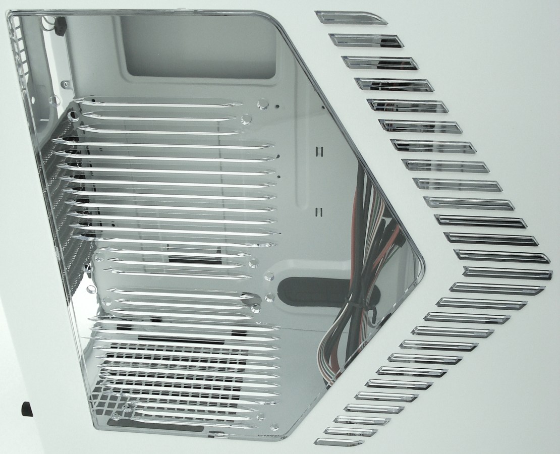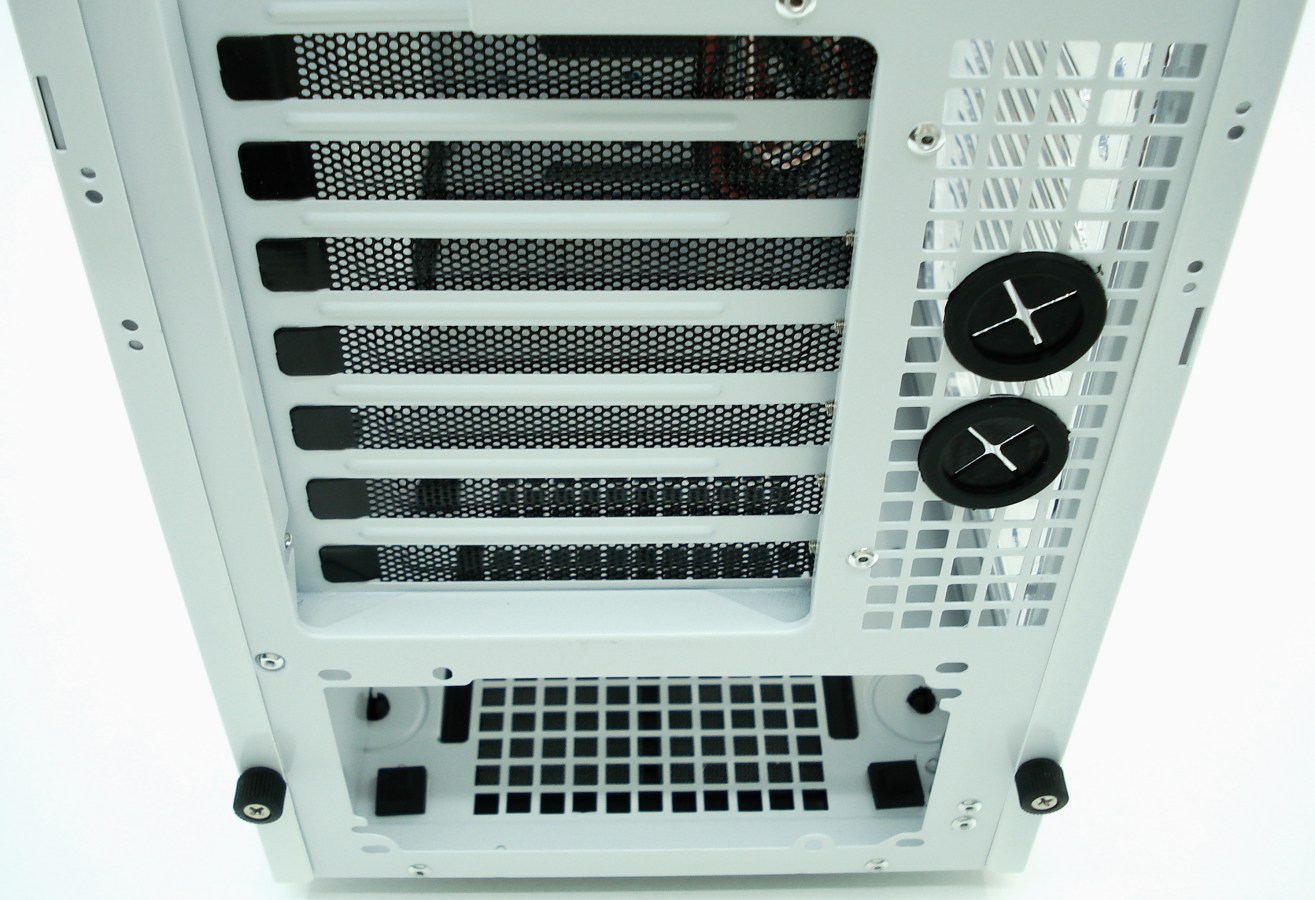 Además, su parte trasera viene casi por completo perforada para ayudar a refrigerar mejor su interior. Posee la posibilidad de instalar un sistema de refrigeración líquida externo, con 2 pasa tubos de goma cerca del armado de las tarjetas PCI – PCIe.