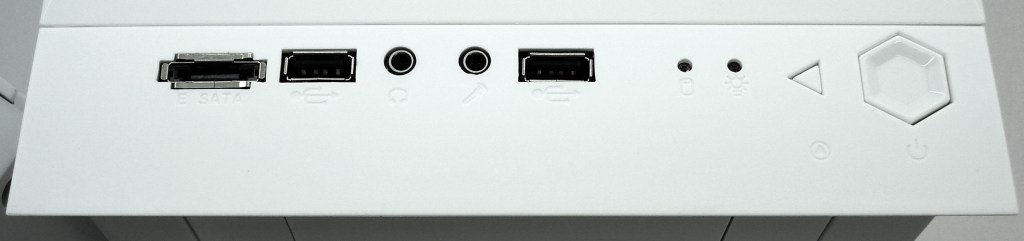 El panel de conexiones es bastante completo. No posee USB3.0, pero sí 2 puertos USB 2.0 y un puerto eSATA. Además trae las típicas clavijas hembras de tipo jack 3.5 para entrada y salida de audio. Otro aspecto que han cuidado los ingenieros es la diferenciación entre los botones de encendido/apagado y el de reinicio, jugando con dos formas, hexagonal y triangular. Aunque el botón del reinicio es algo difícil de pulsar por su reducido tamaño, entendemos que es una forma eficaz de diferenciar los botones simplemente con el tacto (a oscuras) o para la vista (con luz). Por último posee 2 LEDs de indicación de actividad de las unidades y de encendido del sistema.