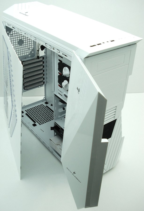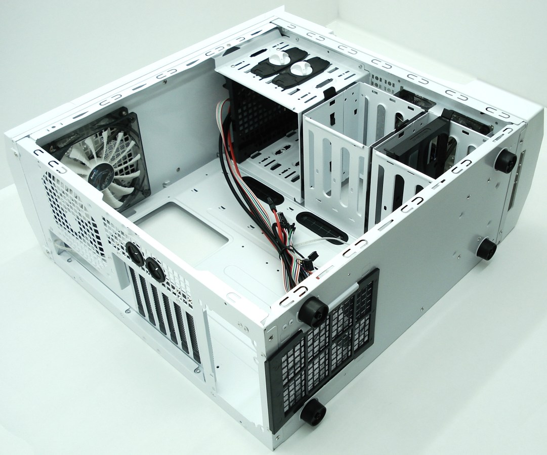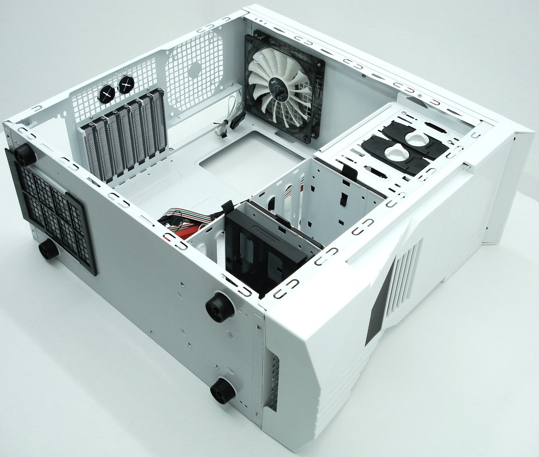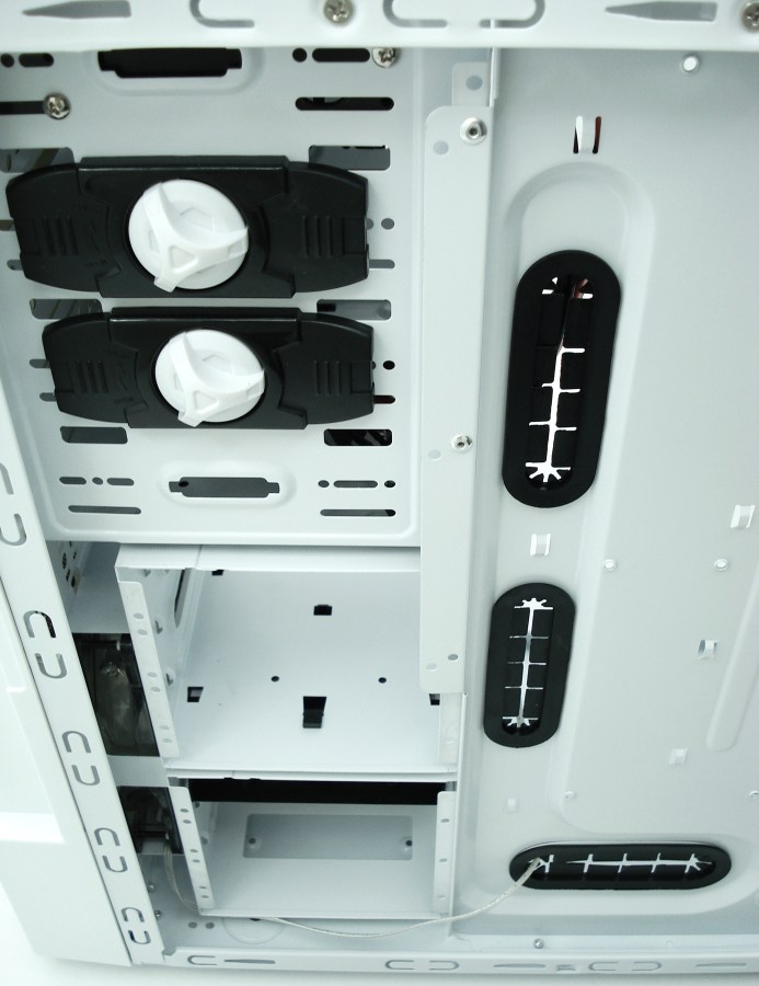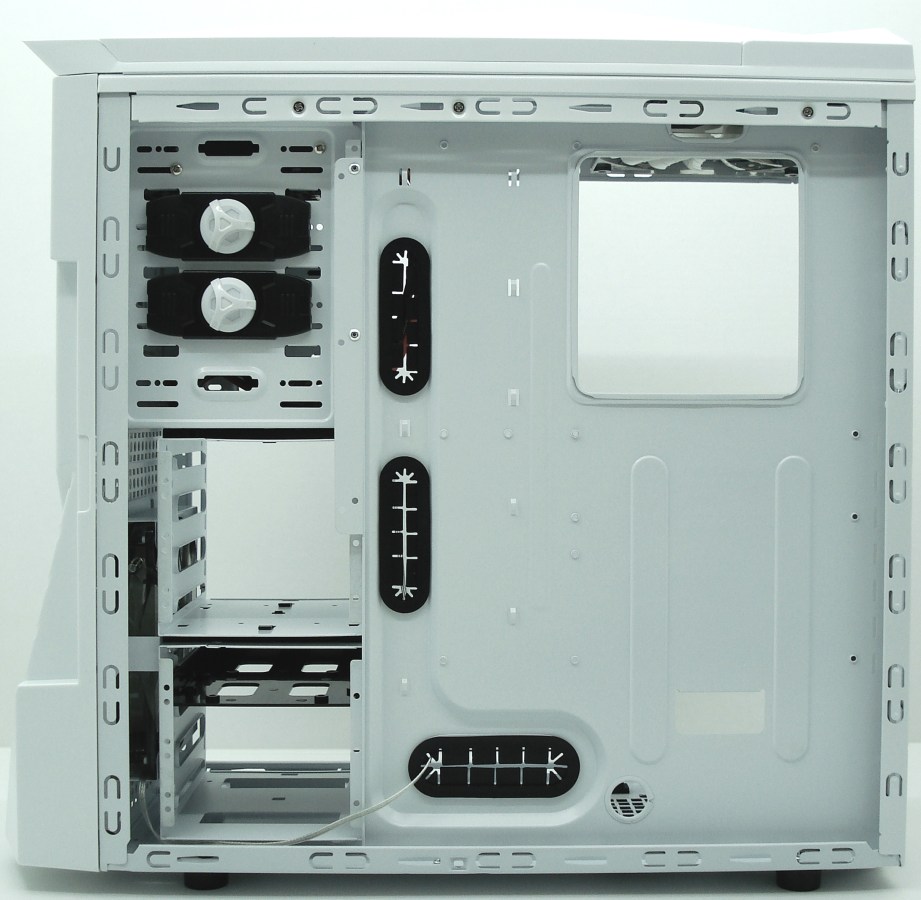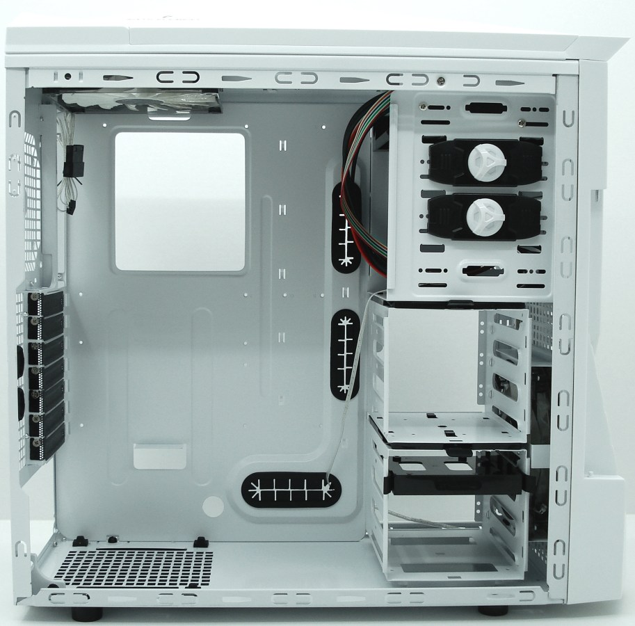 Para desmontar los laterales tan solo debemos desatornillar manualmente 2 tornillos por cada lateral. Su aspecto interior, como ya hemos apuntado, es totalmente blanco, con algunos toques negros en las guías, bandejas de plástico, gomas de protección y placas extraíbles de PCI – PCIe. La fuente se situará en la parte inferior y montada con el ventilador hacia abajo. La zona más relevante es la delantera, donde se colocan las unidades ópticas y los discos duros. Esta zona se caracteriza por tener 3 compartimentos diferenciables, uno de ellos extraíble sin el empleo de herramientas. Este diseño busca dotar a la SIXTH ELEMENT de la máxima flexibilidad posible.