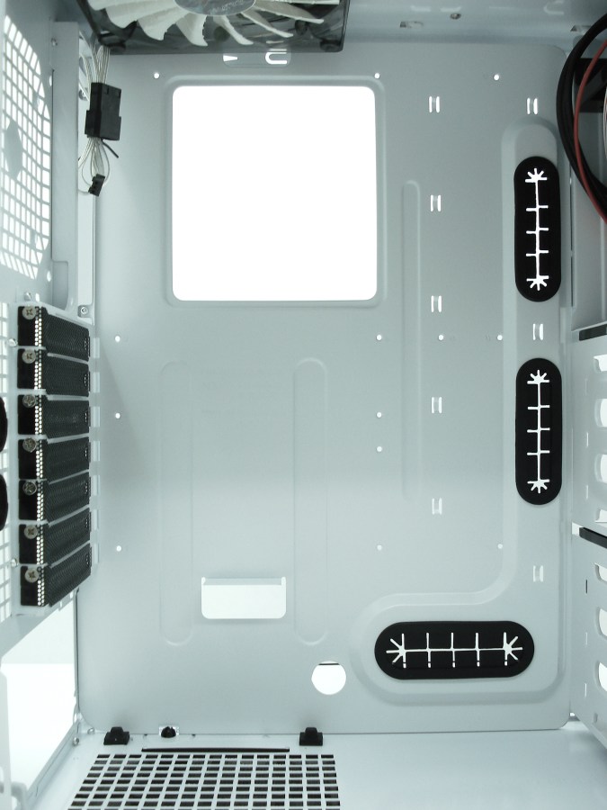 Otro aspecto a tener en cuenta es la gestión del cableado por la parte trasera de la semitorre. Ésta posee 3 perforaciones rectangulares, notablemente protegidas por material de goma de calidad, para evitar cortes en los cables. La chapa interior que fijará la placa base, está suficientemente retranqueada para pasar holgadamente los cables y dejarlos ocultos casi por completo.