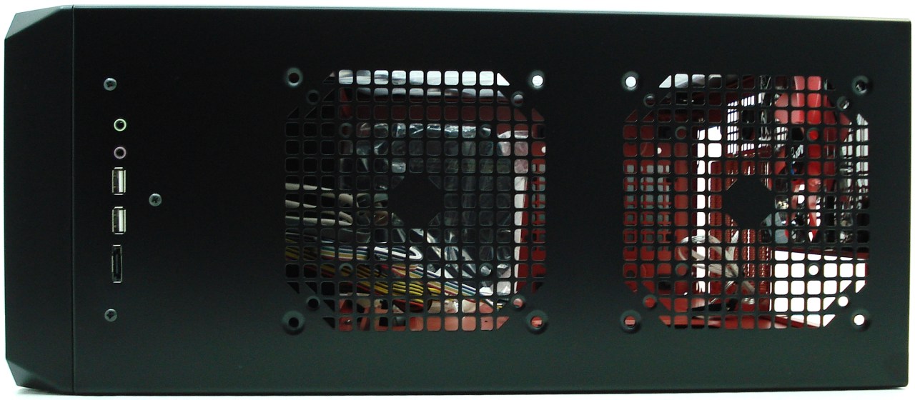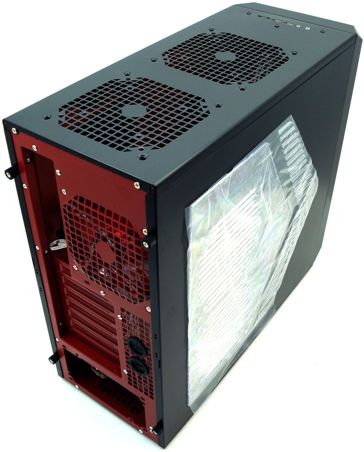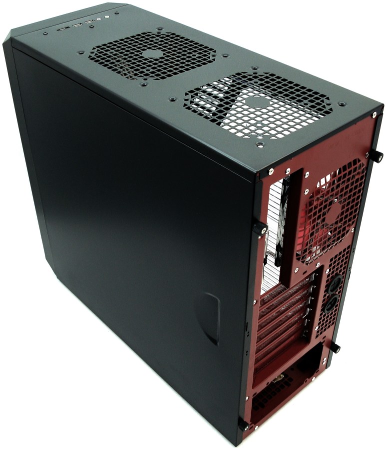 La RS-9 DEVIL RED tiene un diseño simplista y plano, con esquinas ligeramente redondeadas, rebajadas y escuadradas, la mires por donde la mires. Su frontal es enteramente sencillo y plano con todas las tapas microperforadas, del mismo tamaño y diseño. En el lomo se ha perforado con malla cuadricular para poder albergar 2 ventiladores de 12 o 14cm de lado como extractores del aire. Su acabado es completamente negro por su exterior y rojo en su interior, trasero e inferior. Su ventana lateral es de metacrilato transparente, con la posibilidad de instalar otros 2 ventiladores de 12 o 14cm de lado en ella, para introducir o extraer el aire según nos convenga, tal como veremos más adelante…