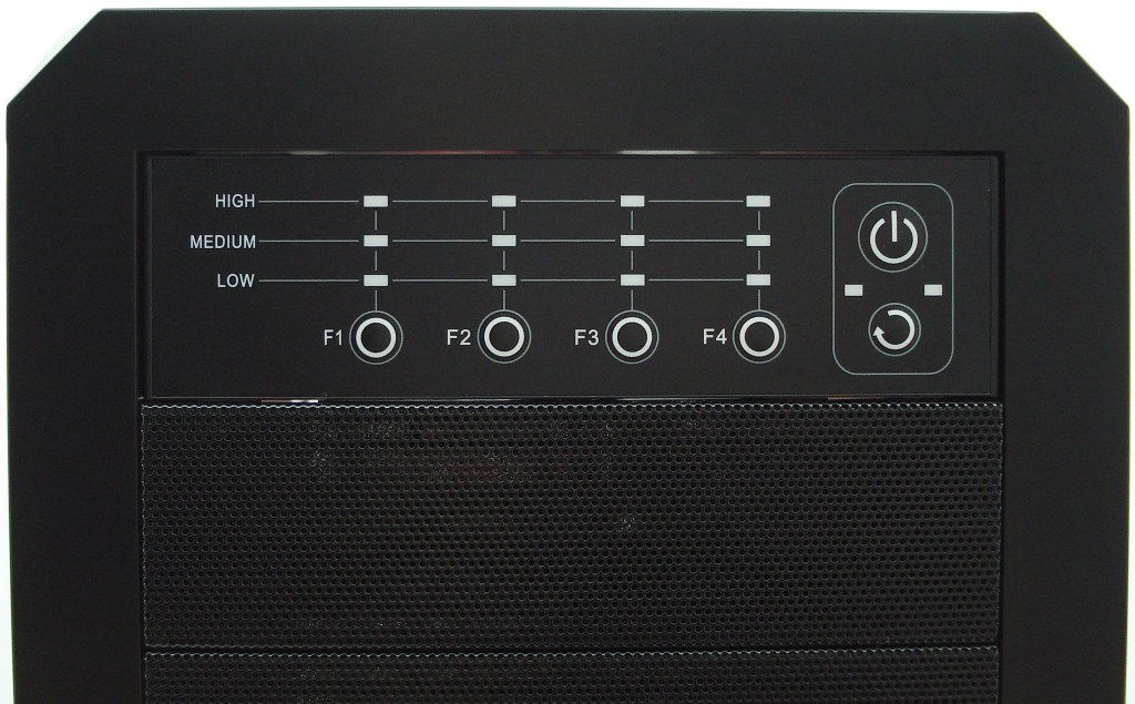 El panel controlador de revoluciones es sin duda la gran baza de la RS-9 DEVIL RED. Con la posibilidad de controlar hasta 4 canales independientes de 20W cada uno, tendremos el control a 3 velocidades distintas, del 50 80 y 100%, en baja media y alta velocidad respectivamente. Todos se controlan con unos prácticos botones táctiles redondeados. Pulsándolos en secuencia se logra cambiar de potencia. Para entender el nivel de potencia en el que funciona cada canal, se han colocado 3 LEDS en columna de color rojo. Así, suman un total de 12 LEDs. Este panel nos recuerda al panel controlador AEROCOOL F4XT, ya que su aspecto es prácticamente el mismo, salvo alguna modificación.