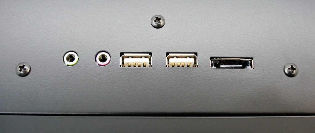 El panel de conexiones es bastante completo, pero demasiado sencillo. No posee USB3.0, pero sí 2 puertos USB 2.0 y un puerto eSATA. Además trae las típicas clavijas hembras de tipo jack 3.5 para entrada y salida de audio. Estamos algo en contra de que estos conectores se sitúen en esta zona, ya que pueden acumular polvo sin remedio.