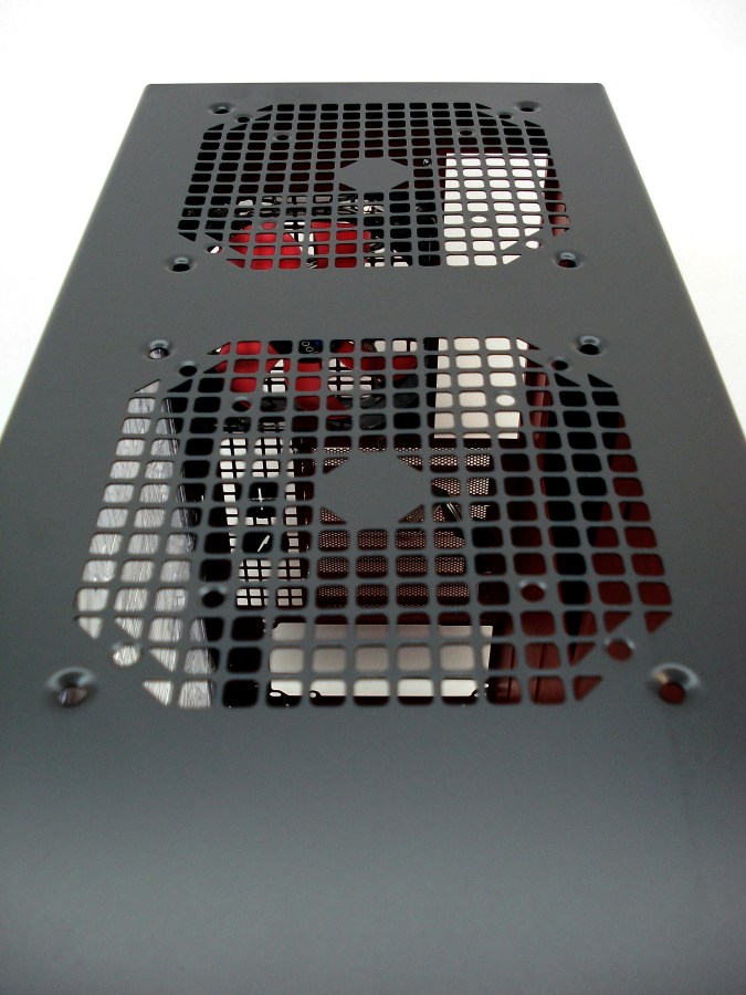 El sistema de refrigeración activa es algo destacable en la RS-9 DEVIL RED. Con 2 puntos de entrada de aire y 3 de salida, se garantiza un caudal y renovación de aire aceptable para una semitorre de estas dimensiones. Posee una entrada de aire por su frontal con 1 ventilador de 12cm (incluido) y entrada (o salida) de aire por la ventana lateral con 2 ventiladores de hasta 14cm. Para la salida de aire posee 2 puntos en su lomo con la posibilidad de colocar otros dos ventiladores de hasta 14cm (no incluidos) y 1 trasero de 12cm (incluido). Añadiendo 4 ventiladores más tendríamos un sistema más que eficiente para componentes de gran potencia (generadores de gran calor). No obstante, con 2 ventiladores adjuntos, ya se garantiza un buen circuito de ventilación interna. Aconsejamos la colocación de uno lateral introduciendo aire fresco, para tarjetas gráficas de alto rendimiento.