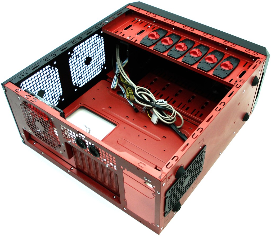 - Notables ventiladores y apartado de refrigeración activa. La RS-9 DEVIL RED posee 2 ventiladores de 12cm de buen caudal (casi 60 CFM de flujo de aire) con un voltaje de 12V con una sonoridad equilibrada. Además, poseen 4 potentes LEDS de color rojo que aumentan su aspecto modding. Cada uno de ellos incluye adaptadores de 4 a 3 pines, además del cable de RPM en el de 3 pines. A parte, se puede ampliar con 4 ventiladores más para aumentar el apartado de refrigeración de hasta 14cm cada uno, y uno más de 8cm en la bandeja delantera. Por otro lado es compatible con RL externo.