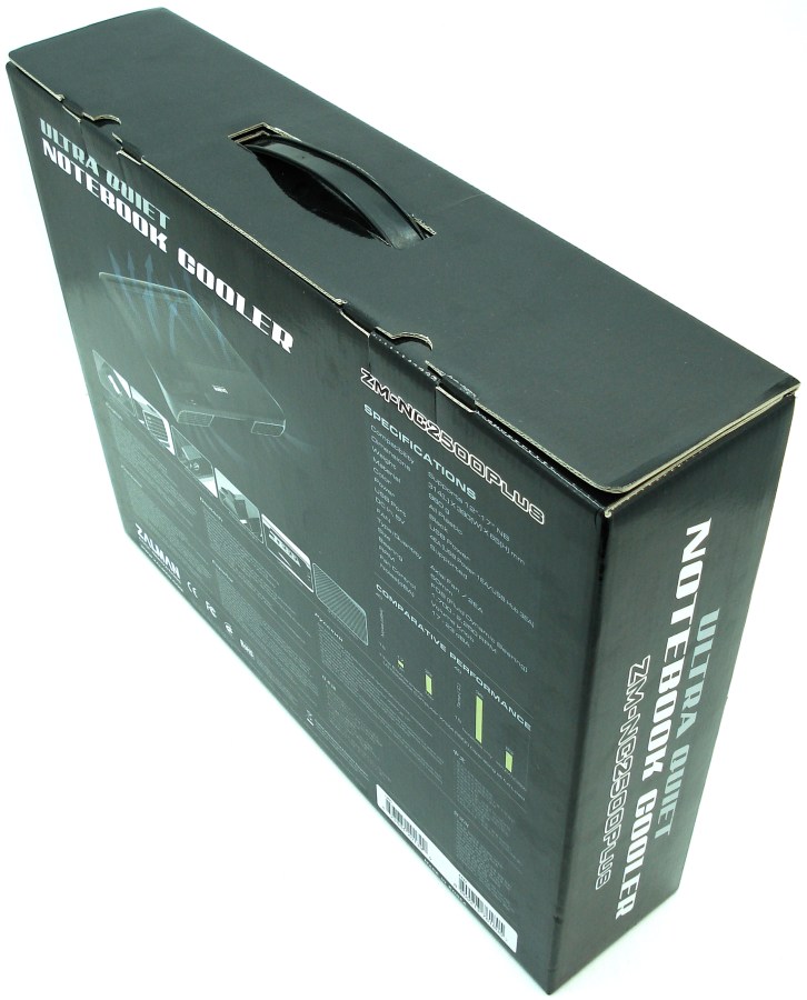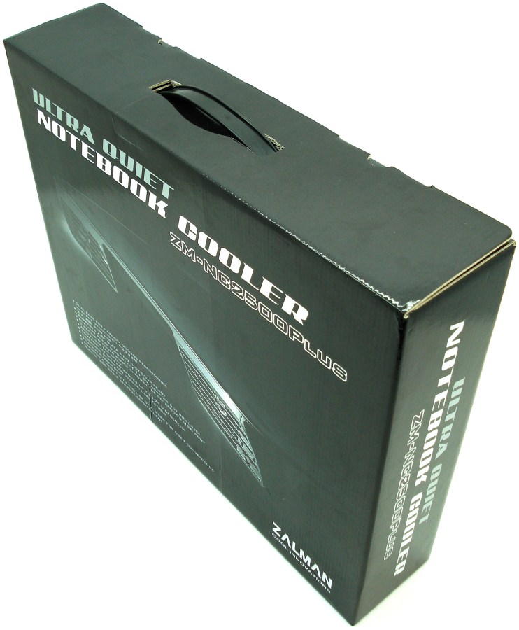 El embalaje es una práctica caja rectangular con una asa para su transporte. Pintada por fuera totalmente en negro, se nos informa en la parte trasera de todas sus especificaciones técnicas en el idioma inglés. También se adjunta una tabla comparativa del rendimiento de refrigeración tomando como producto de prueba el Notebook LG Xnote R500, bajando su temperatura entorno a los 20 grados en su rendimiento en reposo.