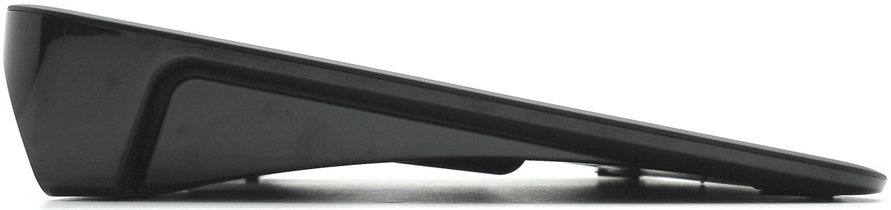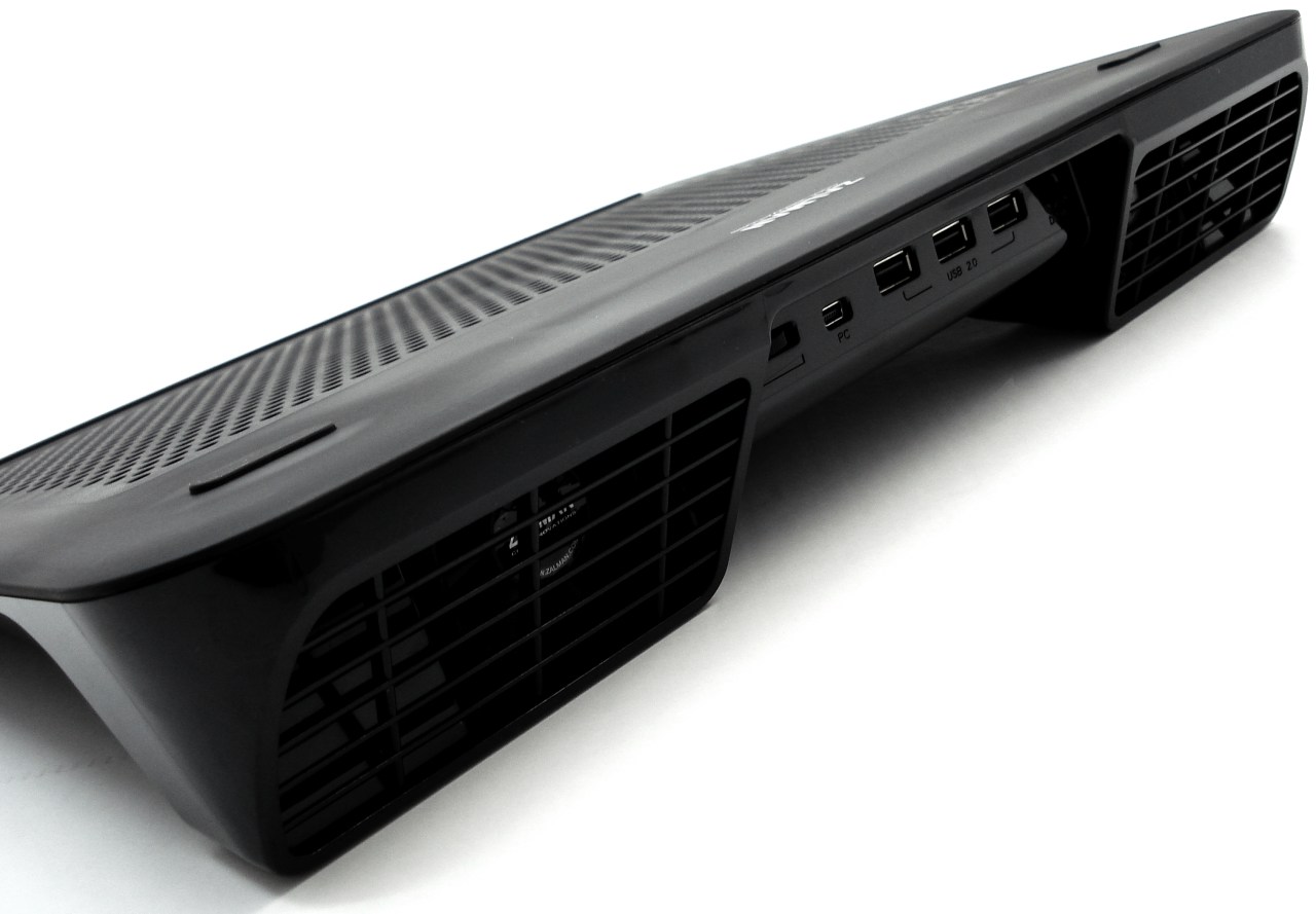La base es de plástico enteramente rectangular, con esquinas curvadas para matar los cantos, haciéndola así más agradable al tacto. Totalmente en negro, la cara superior es en acabado mate y el resto está pulido al brillo. El verdadero volumen lo tenemos en la parte trasera, con varias cosas a tener presente.