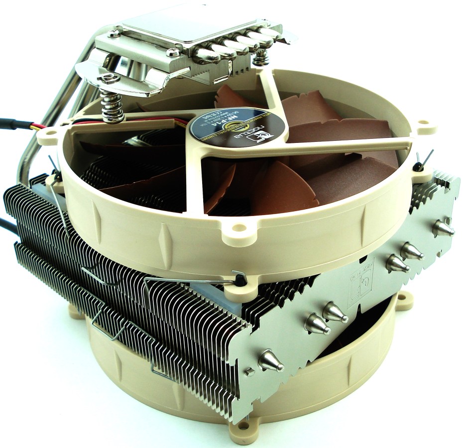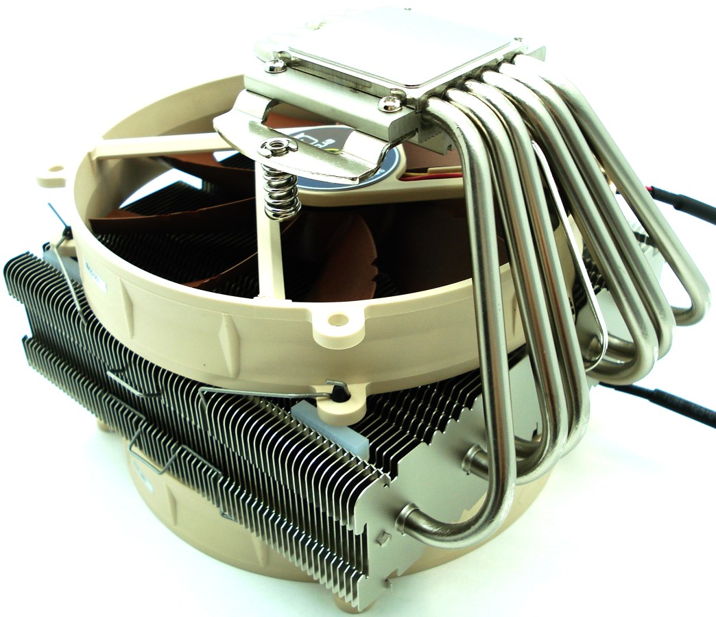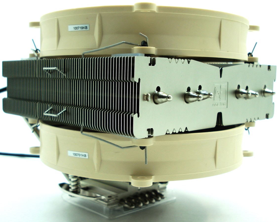 El diseño sin duda es la gran virtud que posee el NH-C14. Como su sigla indica, tiene forma de «C» gracias al curvado de sus 6 heatpipes. Se ha calculado una distancia razonable para conseguir el poder instalar un ventilador de 2.5cm de canto holgadamente en la parte inferior del disipador, entre la base y las láminas de aluminio. Con el ventilador inferior instalado, todavía se queda una altura razonable de separación de unos 38mm, según hemos comprobado, (sus gomas antivibracones lo elevan 2mm) respecto de la superficie superior del procesador instalado. Si prescindimos del ventilador inferior, conseguimos una separación de 65mm, suficiente para no estorbar a posibles memorias RAM que instalemos con perfiles altos de sus disipadores. Por otro lado, si prescindimos del superior, el disipador ocupa en altura 105mm, con lo que podremos de paso instalarlo en cajas pequeñas, como en minitorres o barebones (mientras quepa en anchura), sin tener que huir de una refrigeración elevada.