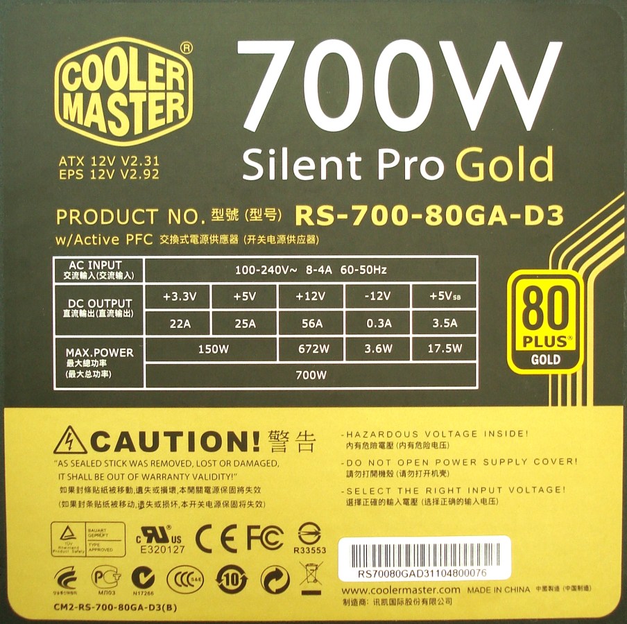 COOLER MASTER SILENT PRO GOLD 700W. Detalle Pegatina Especificaciones Técnicas