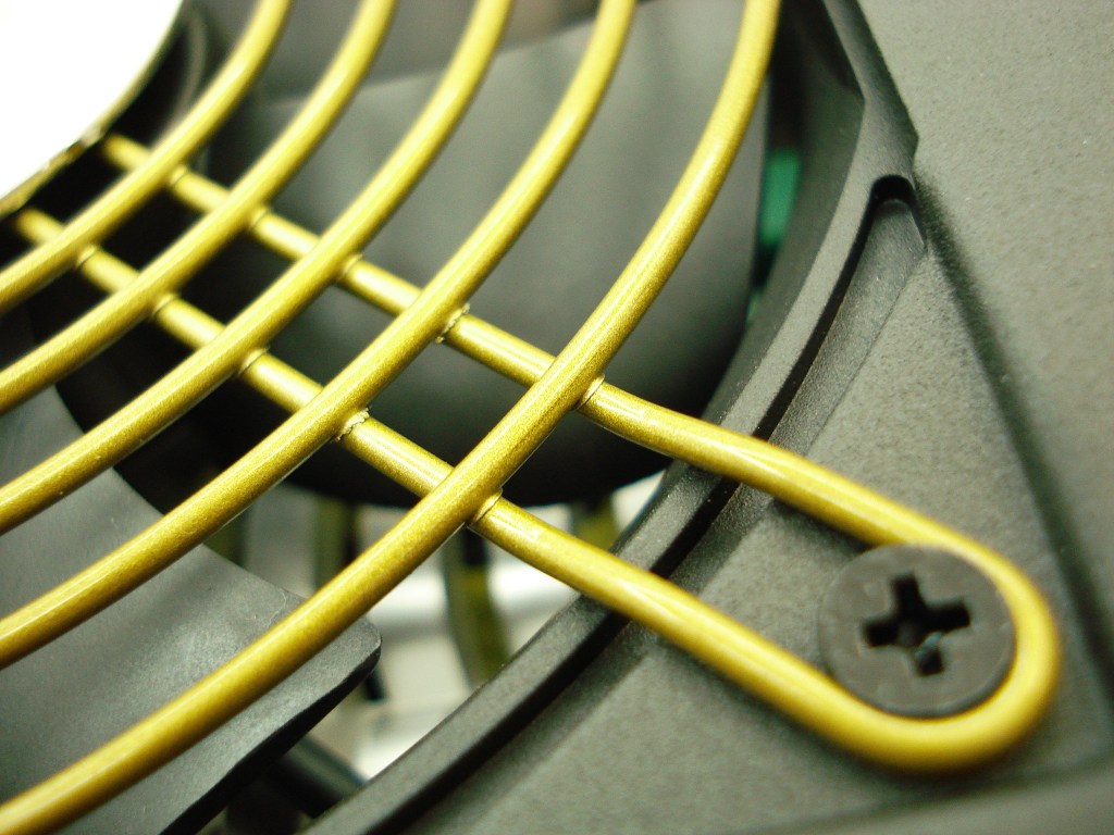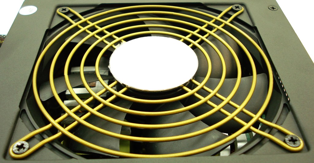 Para la refrigeración activa dispone de un ventilador de 12cm sin LEDs que rota regulado automáticamente entre los 800 y 1300 R.P.M. aproximadamente, con una sonoridad entre los 21 y 30 dBA. Este ventilador viene protegido por una parrilla circular de 5 anillos y de color dorada, con una chapa central con el logo de la marca con un bonito plateado.