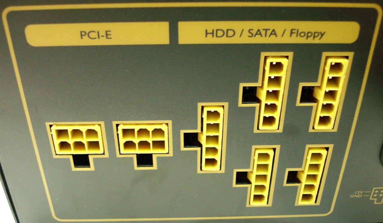 El panel de conexiones frontal es del todo completo para una fuente de 700W, enteramente modular. Con la distinción por tamaños de los conectores, se divide la zona en 2, para 2 conectores PCIe y para 5 conectores para HDD, SATA y Floppy. De este modo es imposible equivocarnos facilitando la operación de conectividad.