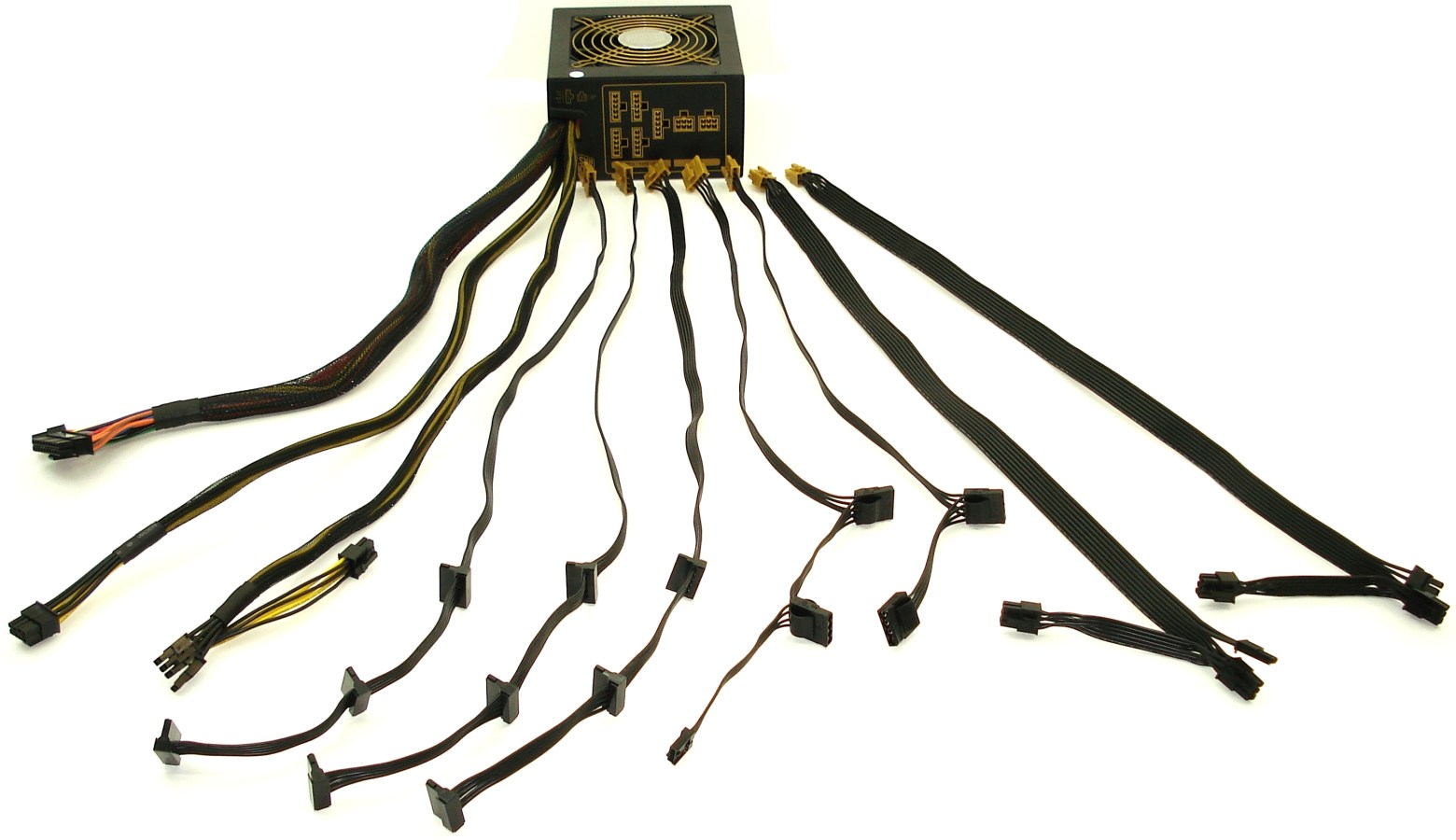 Todos los conectores de los cableados modulares son de calidad y fácilmente conectables/desconectables, y de fácil distinción por la combinación, de nuevo, de los colores dorado (para conectar en el panel delantero de la fuente, distinguiendo dos tamaños, rectangular de 6 pines y lineal de 5) y el negro. Quizá a algunos les parezcan algo cortas sus longitudes, y así es en algún caso para el usuario que quiera instalarla en alguna torre de elevadas dimensiones y quiera pasar los cables por detrás de la misma, escondiéndolos. No habrá ningún problema de alcance para instalarla en cualquier semitorre. Esto puede convertirse en según qué casos en un inconveniente, entendemos que las longitudes no son muy generosas, quedándose algo gustas, recortando así la flexibilidad del producto.