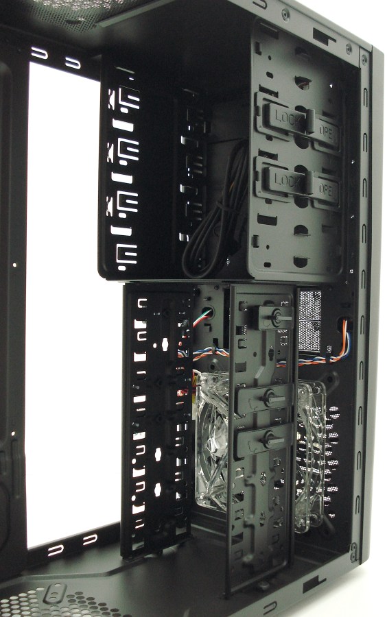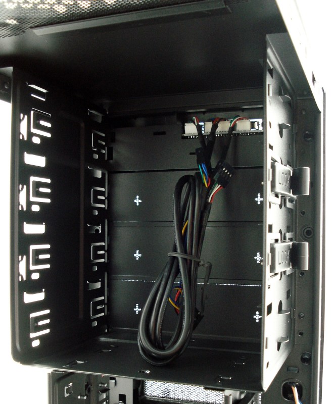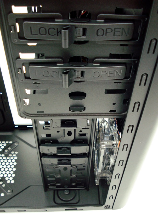 La zona delantera para instalar unidades lectoras o discos duros, entre otros, está francamente lograda en la parte inferior, en la altura de las unidades de 3.5″. Esto permite el poderse instalar tarjetas gráficas de larga longitud. Tendremos 2 pares de ejes de fijación manuales sin la necesidad de emplear tornillos para las unidades de 5’25» y otras 2 para las unidades de 3.5″, dejando las demás alturas para poderse montar con tornillos de montaje (adjuntos). Estos ejes son extraíbles y regulables en altura para colocar las unidades empleadas donde queramos sin el uso de herramientas.