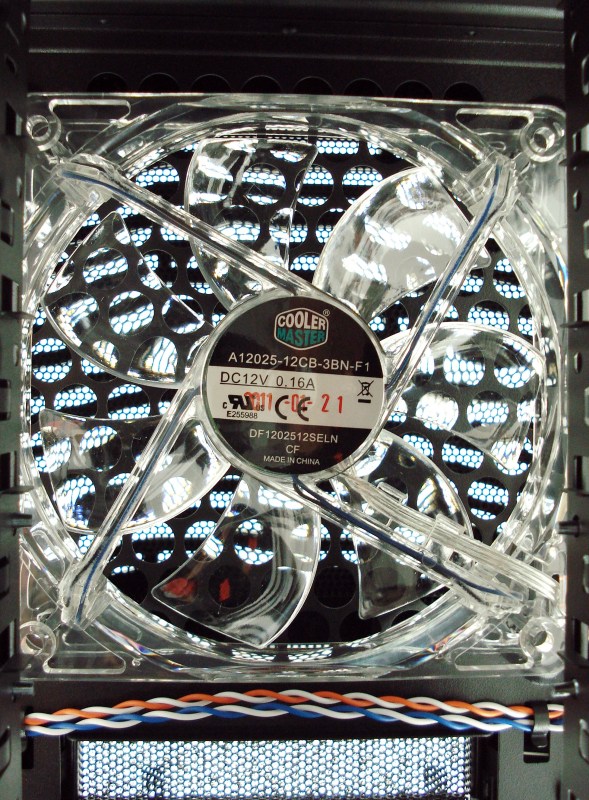 Este es el ventilador de 12 frontal visto por la parte interior. Posee 4 LEDs azules por lo que le da un toque ligeramente modding visto por la parte delantera, en el frontal. El modelo es el A12025-12CB-3BN-F1 (DF1202512SELN CF), también fabricado en China. Funciona con 12V de tensión a 0’16A. Se alimenta con un conector de 3 pines, con adaptador a 4 pines adjunto. Desconocemos más características técnicas de esta unidad, aunque su sonoridad, según nuestras pruebas es media, entorno a los 17-23dBA.