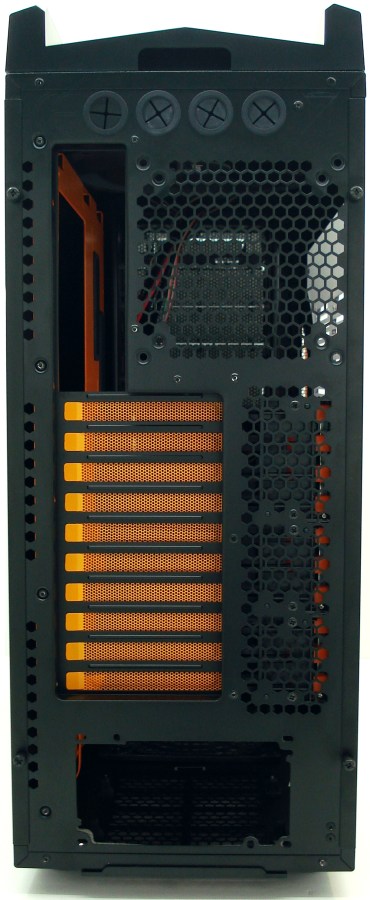 Pese a ser una torre de grandes dimensiones (60 cm de alto) tan solo se le puede instalar un ventilador trasero de 12/14 cm. En la primera línea superior del cuerpo de acero se sitúan 4 perforaciones circulares pasa-tubos para RL, todas protegidas mediante gomas y con un diámetro de paso interior de 2cm. Si nos fijamos bien, podemos ver prácticamente toda la zona trasera abierta por perforaciones, la mayoría en panel de abeja (perforaciones hexagonales), tanto en la rejilla del ventilador, como en todo el recorrido en altura de los slots PCI, como curiosamente en una línea vertical por detrás de la zona de la placa base. Por lo que esta torre, por la zona de atrás también está muy bien ventilada apenas con caudal de aire.