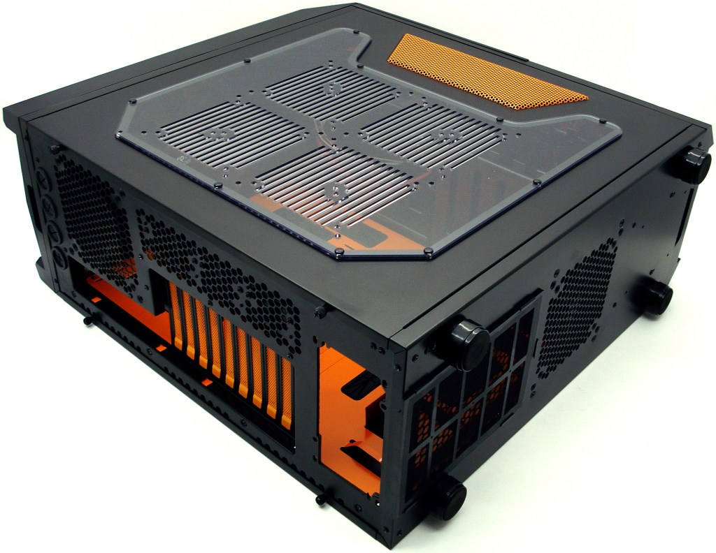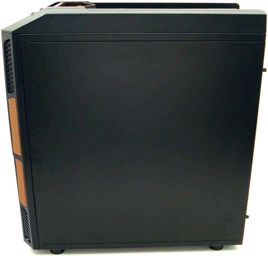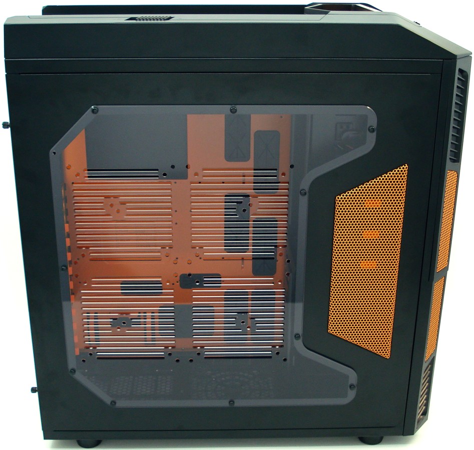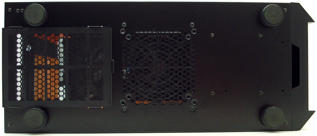 El diseño del frontal es muy acorde al diseño del lomo, y su lateral conjuga perfectamente con ambos. No obstante, el lomo ocupa bastante en altura, casi 5cm, y junto con la línea de pasa-tubos para RL impide la instalación de otro ventilador en la zona trasera, aunque ésta está prácticamente toda perforada. Esto es debido al diseño del lomo, que necesita cierto volumen para encerrar las escamas superiores abatibles. Por lo demás, la fuente de alimentación se sitúa en la parte inferior, y tal como veremos, los discos duros se colocarán en sentido perpendicular al eje longitudinal de la torre.