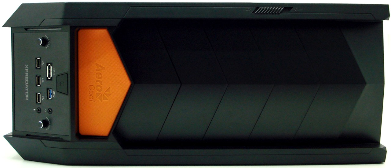 Una de las mejores caras del volumen de la XPREDATOR es sin duda su lomo. La parte superior tiene un diseño único, distinto a cualquier diseño visto hasta ahora y que le da bastante funcionalidad a toda la superficie. Por un lado tenemos una panel de conexiones frontal-superior muy bien equilibrado. Justo al lado un reposa-objetos. Y por otro lado tenemos un lomo de apertura y cierre, para dejar salir el aire caliente por arriba, o cerrar el lomo para que no entre polvo cuando el PC esté apagado. Toda esta funcionalidad está en completa armonía con el diseño empleado, muy arriesgado y francamente bello. Seguro que muchos usuarios serán capaces de apreciar estos matices de la torre.