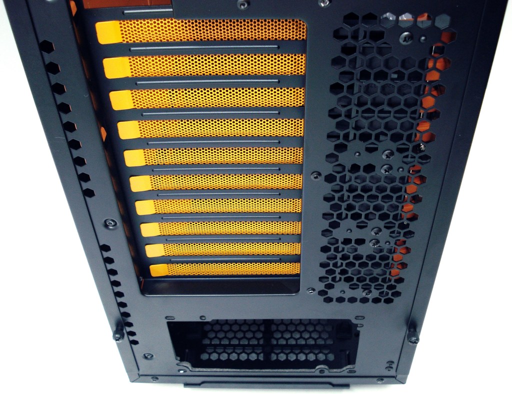 En la parte trasera podemos realizar hasta 2 cambios. Por un lado, tenemos la posibilidad de girar 180º la fuente de alimentación en su montaje, por lo que podremos colocar su ventilador hacia arriba o hacia abajo. Por otro lado, se puede desmontar el mecanismo de anclaje de todas las placas metálicas traseras PCI. Este mecanismo está armado con 4 tornillos de montaje por la parte trasera, por tanto es desmontable, sustituyendo dicho mecanismo por los correspondientes tornillos de montaje individuales por cada placa metálica PCI, también adjuntos.