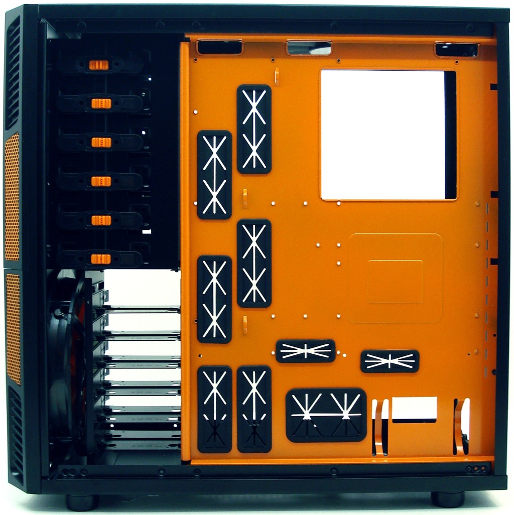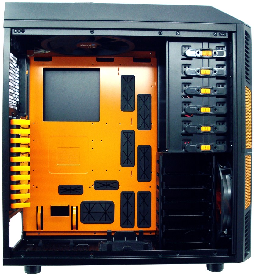 Echando la vista más hacia su interior, vemos que AEROCOOL se arriesga por el color naranja para combinarlo con el negro. Sin duda le da un contraste muy bueno al ser dos colores que combinan muy bien. Su interior está repleto de características muy destacables.