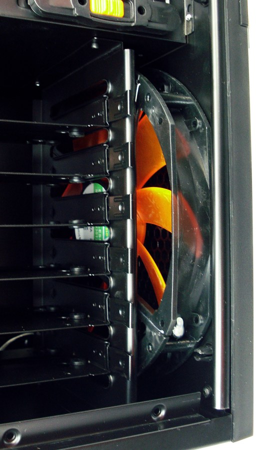 Estos son los 2 ventiladores adjuntos con la torre XPREDATOR. Ambos son idénticos, y según el fabricante, poseen las mismas especificaciones. El frontal posee 4 potentes LEDs de iluminación y todas sus aspas de color naranja translucido. El superior puede ser sustituido por 2 ventiladores de 12/14 cm. En cambio el ventilador frontal únicamente puede ser sustituido por un ventilador de 12/14 cm. Tal como hemos comentado, su caudal es bastante contenido, con un nivel de ruido de 27dBA. Su duración es también contenida, en torno a las 25000 horas, sabiendo que tenemos en el mercado modelos que superan ya las 100000h (4 veces más durabilidad).