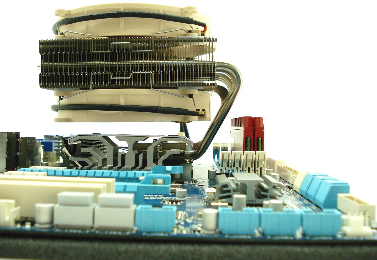 La única solución es girar 180º el disipador Noctua (recordamos que la configuración del socket AM3 solo permite giros de 180º) y eliminar el ventilador inferior de 14cm para que los 2 módulos de memoria sean instalados correctamente en los bancos azules, tal como nos aconseja el fabricante. Otra solución menos económica sería sustituir los disipadores de las memorias por otros de perfil más bajo, si queremos tener instalados los dos ventiladores del disipador para mayor caudal. En este caso, con ser los disipadores de los módulos 4mm más bajos (o el disipador del procesador 4mm más alto), se hubiera solucionado este caso en concreto. Desgraciadamente, esta clase de incompatibilidad se repite en muchas configuraciones de componentes del mercado, con las que tendremos que estar alerta antes de adquirir ciertos componentes de nuestro futuro equipo si no queremos tener sorpresas.