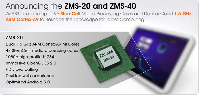Estos son los ZMS-20 y ZMS-40, siendo el primero la versión de doble núcleo y el segundo la de cuatro. Ambos procesadores funcionan a 1.5 Gigahertz, y su destino en el mercado es muy claro, tabletas que posean sistema operativo Android Honeycomb (versión diseñada por Google especialmente para tabletas de alta gama). Su diseño está basado en el mismo de sus competidores, como son los ARM Cortex 9 (Neón) que esta presente en los Nvidia Tegra 2, Apple A5, Samsung Exynos y los