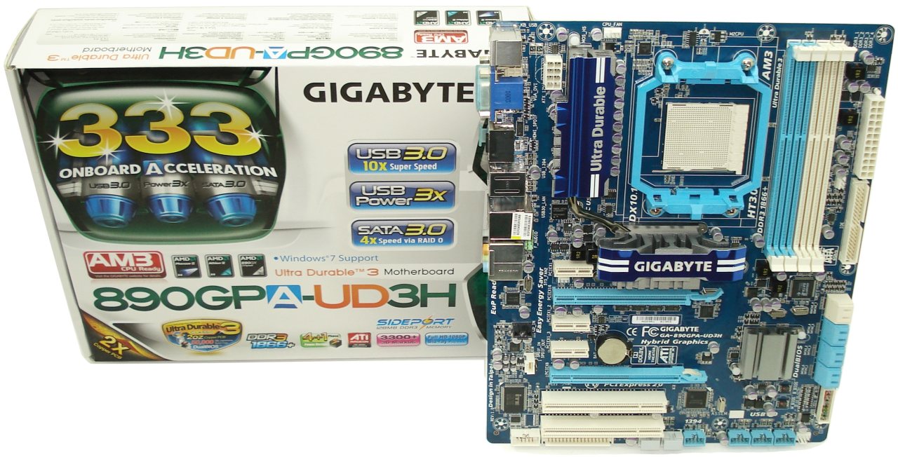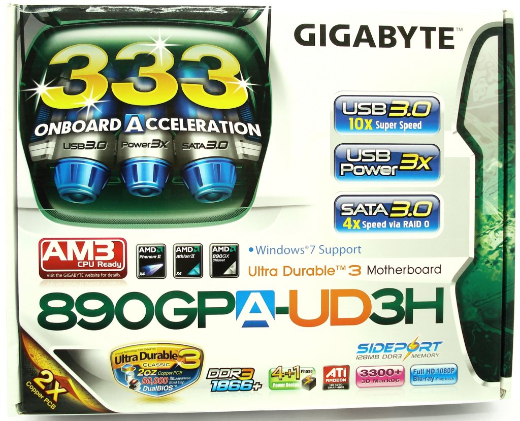 De entrada, ya estamos muy acostumbrados a la estampa que suele ofrecer Gigabyte en sus embalajes. En este caso viene perfectamente estudiado, ofreciendo toda clase de detalles referentes a sus características, únicamente en el idioma inglés. Para mayor atracción se han inventado el triple 3 para hacer referencia a las tecnologías más punteras que ofrecen; Onboard Acceleration de Gigabyte con, USB3.0 a 10x, SATA3.0 a 4x con Raid0 y USB Power3x. Además, cabe destacar otra de las características más interesantes es que está fabricada con la patentada tecnología Ultra Durable 3 Classic, con doble capa de cobre, condensadores sólidos japoneses de 50.000 horas de duración estimada antes de fallar, y Dual BIOS. Además posee 4+1 fases para estabilizar la tensión ofrecida al procesador. Equipa el chipset 890 con el North Bridge 890GX y South Bridge SB850, con el que podremos desbloquear núcleos inhabilitados del procesador, en caso de haberlos. Por último, a parte de la compatibilidad para procesadores AM3, dispone de gráfica integrada de elevada performance en el propio North Bridge con 3300+ de puntuación en el 3D Marck, algo que no está para nada mal en una integrada. De ahí que disponga de un disipador pasivo bastante grande, ya que será el chip North Bridge el que mayor calor genere.