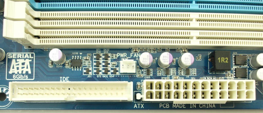 Aquí tenemos varios detalles de varios conectores, así como parte de los componentes eléctricos superficiales más importantes, como los transistores o mosfets, condensadores sólidos y chips integrados. Éstos últimos los veremos con mayor detalle en las últimas páginas, al menos los más importantes. Se nota que Gigabyte le da ímpetu a su tecnología Ultra Durable, y aprovecha el disipador más alargado para mostrárnoslo. El acabado conjunto, sin duda es bastante atractivo. De momento, la única pega es la cercanía de este disipador al conector de 4+4 pines para alimentar la CPU, que cuesta lo suyo conectar.